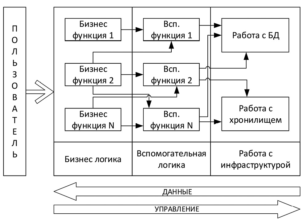Так, к примеру, на рис. 1 выделены уровни абстракции [9], обеспечивающие управляемость и снижение сложности программного обеспечения за счет вынесения основной логики на верхние слои и распределения рутинной и малозначимой логики на нижних. На верхнем уровне исполняется бизнес-логика (полезные функции — ценность), нижние уровни реализуют вспомогательные функции и взаимодействие с инфраструктурными системами (база данных, хранилище и т. д.). Программные единицы верхнего уровня изолированы от исполнения нижестоящих, которые являются для него черным ящиком, обеспечивающим использование определенного набора функций, уменьшая общую связность между программными единицами. При этом элементы одного уровня абстракции взаимодействуют между собой только через вышестоящий (управляющий) уровень, эти особенности способствуют удобству для поддержки, развития и тестирования исходного кода программного обеспечения.
