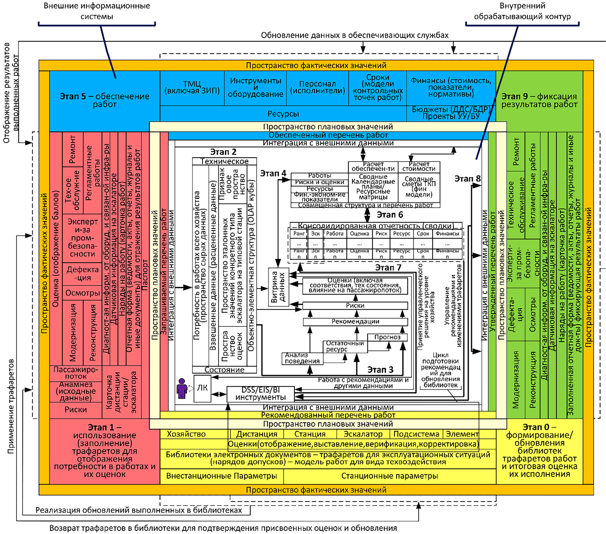 В свою очередь пользователями внешней информационной системы в соответствующих создаваемых сущностях/субсущностях на этапе пять фиксируется использование имеющихся (резервирование доступных) или заказ недостающих ресурсов в обеспечение совмещенной структуры и перечня работ. Пользователи внешних информационных систем также формируют финансово-экономические показатели (бюджеты, нормативы и т. п.) соответствующих технических воздействий по видам работ и объектов учета (элемент, подсистема, эскалатор, станция, дистанция, хозяйство) в соответствующих сущностях/субсущностях.