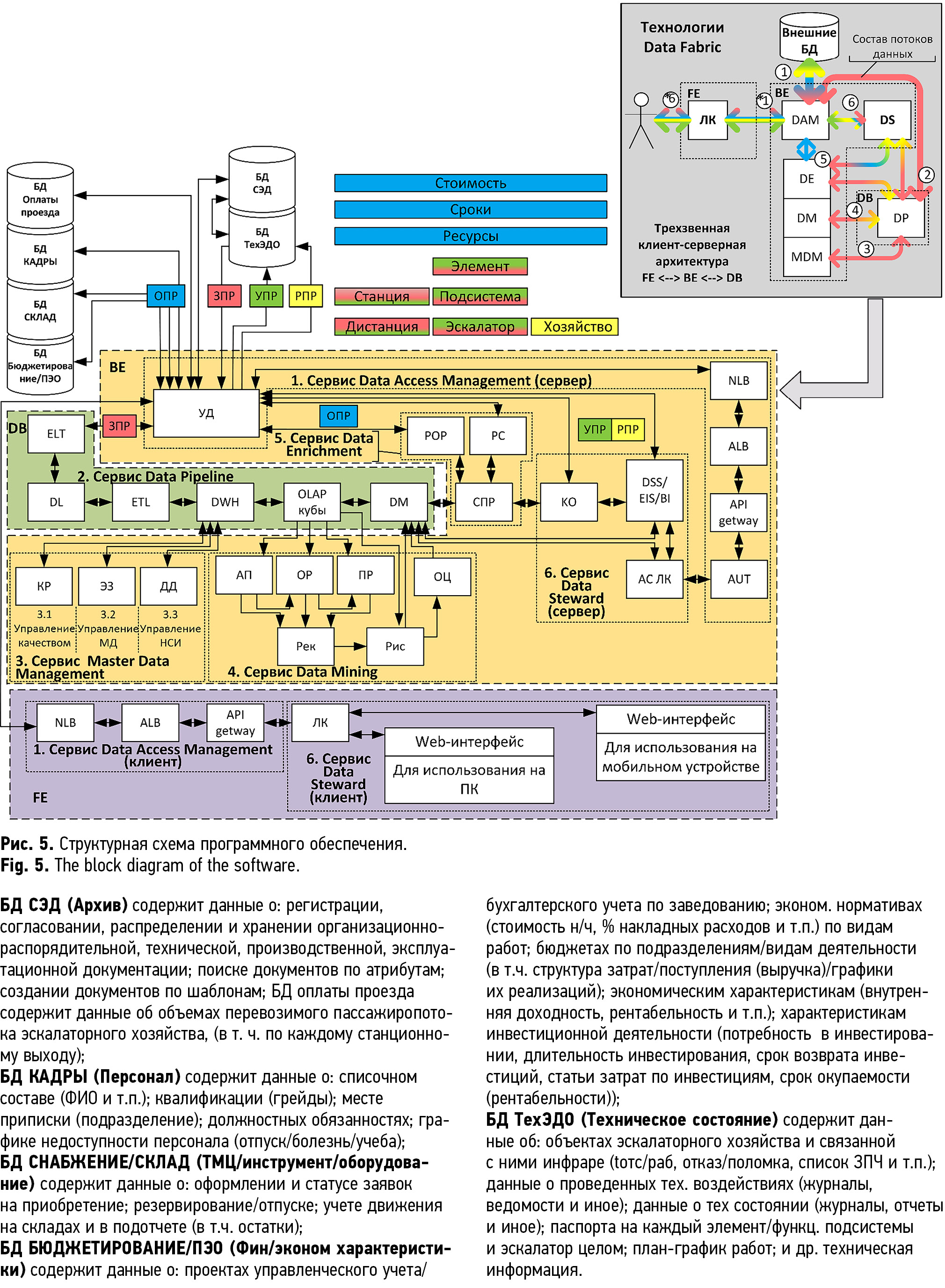 На рис. 5 обозначено: FE — front-end — клиентская часть; BE — back-end — серверная часть; DB —Database — работа с базами данных. ОПР — обеспеченный перечень работ; УПР — утвержденный перечень работ; ЗПР — запрашиваемый перечень работ; РПР — рекомендованный перечень работ. Сервис Data Access Management — сервис управления доступом и балансировки данных: УД — программно-аппаратный комплекс предназначенный для организации эффективной защиты периметра сети (к примеру ПАК «Рубикон»); NLB (Network Load Balancing L4) — сервис распределение приходящих запросов на несколько физических или виртуальных узлов серверов; ALB (Application Load Balancing L7) — сервис для распределения нагрузки по сервисам и приложениям; API getway — шлюз между пользователями и сервисами через API; AUT — модуль аутентификации пользователя. Сервис Data Pipeline — конвейер подготовки данных в составе: ELT — сервис работы с данными; DL (Data Lake) — хранилище сырых данных; ETL — сервис работы с данными; DWH (Data Warehouse) – хранилище подготовленных данных; OLAP-кубы — многомерный массив данных; DM (Data Mart) — множество тематических баз данных. Сервис Master Data Management —сервис управления мастер-данными и нормативно-справочной информацией в составе: КР — сервис контроля работ (управление качеством выполненных работ через балльную оценку); ЭЗ — сервис эталонных значений (управление мастер-данными); ДД — сервис дополнительных данных (управление нормативно-справочной информацией). Сервис Data mining — сервис интеллектуального анализа данных в составе: АП — сервис анализа подготовленной параметрической информации; ОР — сервис расчета остаточного ресурса; ПР — сервис нейросетевого прогнозирования; Рек — сервис подготовки рекомендаций; Рис — сервис управления рисками; ОЦ — сервис подготовки оценок. Сервис Data enrichment — сервис насыщения данных новой информацией для повышения их ценности для анализа в составе: СПР — сервис совмещения перечня работ; РОР — сервис расчета обеспеченности ресурсами; РС — сервис расчета стоимости. Сервис Data Steward — сервис управлении данными для принятия управленческих решений в составе: КО — сервис подготовки консолидированной отчетности; DSS/EIS/BI — сервис поддержки принятия решения и BI инструментов; АС ЛК — автоматизированная система “Личный кабинет” (серверный компонент); ЛК — сервис “Личный кабинет” (клиентский компонент — UX/UI дизайн).