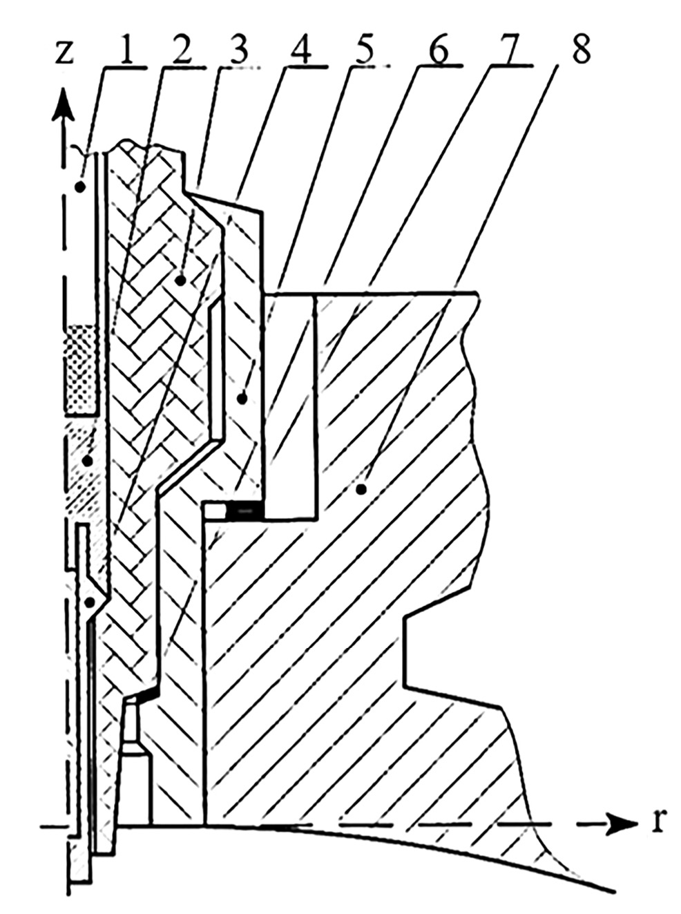 Fig. 3. The calculation scheme of a spark plug: 1 – a contact head; 2 – glass sealant; 3 – an insulator; 4 – a central electrode; 5 – a plug’s body; 6 – a heat-sinking washer; 7 – a sealing ring; 8 - a cylinder head.