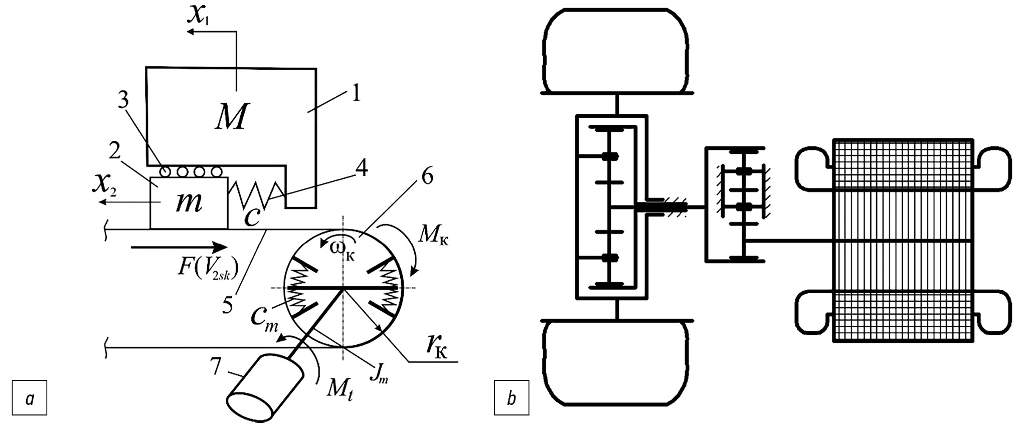 Рис. 1. Схемы взаимодействия эластичного колеса с твердым опорным основанием (а) и схема привода (b): 1 — масса М подрессоренных частей, приходящаяся на колесо; 2 — масса m колеса; 3 — ролики, позволяющие перемещаться колесу без трения в продольном направлении; 4 — упругий элемент (податливость шины в продольном направлении); 5 — опорное основание; 6 —вращающееся колесо; 7 — тяговый электродвигатель.