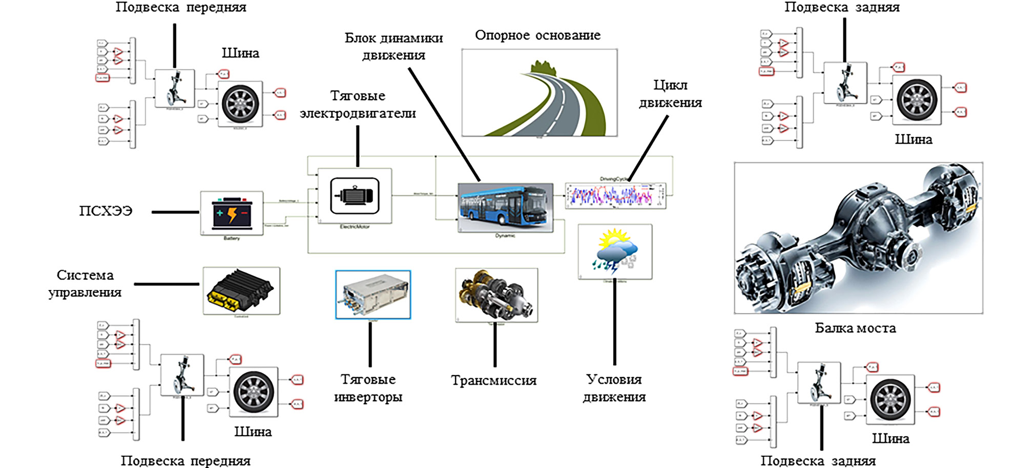 Для исследования автоколебательных процессов в тяговом приводе электробуса большого класса КАМАЗ 6282 [17] используем имитационную математическую модель транспортного средства, принцип которой описан в работах [18–23], дополненной имитационной математической моделью индивидуального тягового электрического привода задних колес в MATLAB&Simulink, показанной на рис. 2.