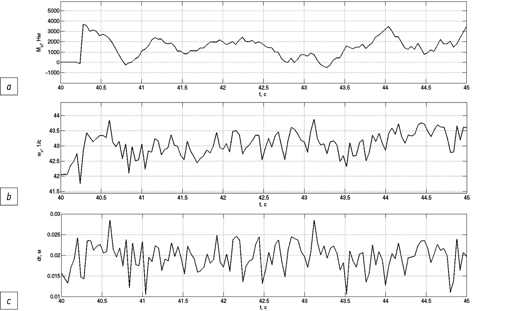 Рис. 3. Фрагменты реализаций крутящего момента тягового электродвигателя (а), угловой скорости вращения ведущего колеса (b) и радиальной деформации шины (c).