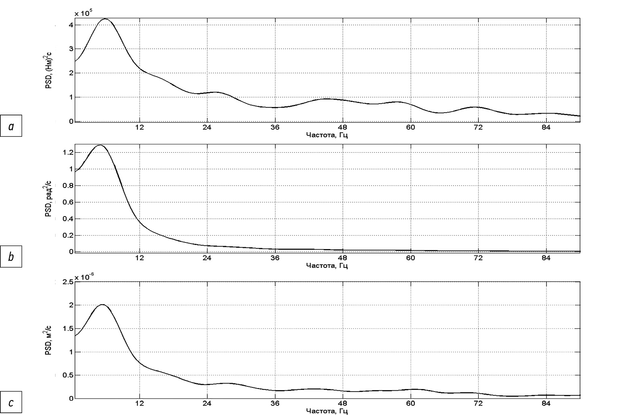 Рис. 4. Спектральные плотности энергии момента тягового электродвигателя (а), угловой скорости вращения ведущего колеса (b) и радиальной деформации шины (c).