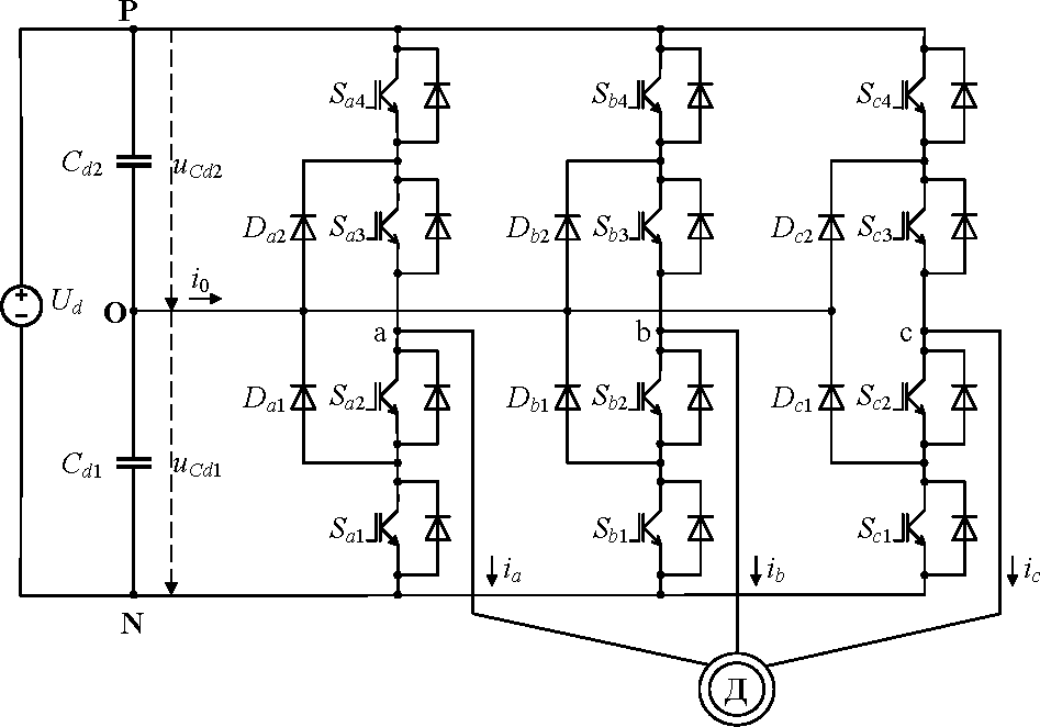 На рис. 1 приведена топология 3У АИН с ФНТ в простой схеме электропривода. Трёхуровневый автономный инвертор состоит из 12 IGBT-транзисторов со встречно включёнными диодами (Sa1Sa4, Sb1Sb4, Sc1Sc4) и 6 дополнительных фиксирующих диодов (Da1, Da2, Db1, Db2, Dc1, Dc2). В звене постоянного тока подключены два одинаковых конденсатора Cd1 и Cd2, обеспечивающих разделение напряжения источника питания Ud на три промежуточных уровня относительно О нейтральной точки (НТ): -Ud/2, 0, Ud/2 [7]. Однако распределение напряжения между конденсаторами на стороне постоянного тока происходит неравномерно, вызывая дисбаланс напряжения НТ. Этот важный недостаток может привести к преждевременному выходу из строя коммутационных приборов, а значение THD выходного напряжения и тока инвертора увеличивается по мере того, как преобладают низкие гармоники [8]. Дисбаланс напряжения НТ чаще всего происходит по следующим причинам [9]: несимметрия номинальных величин конденсаторов постоянного тока из-за производственных допусков, несогласованные свойства коммутационных силовых приборов, несимметричная трёхфазная нагрузка, а также из-за несовершенства алгоритма управления 3У АИН, например, из-за последовательностей переключения базовых векторов в пространственно-векторной ШИМ. Поэтому в статье производится анализ влияния базовых векторов напряжений и различных последовательностей переключения силовых ключей с целью выбора оптимальной последовательности, обеспечивающей наименьшее отклонение напряжения НТ и число переключений силовых ключей в схеме 3У АИН с ФНТ.