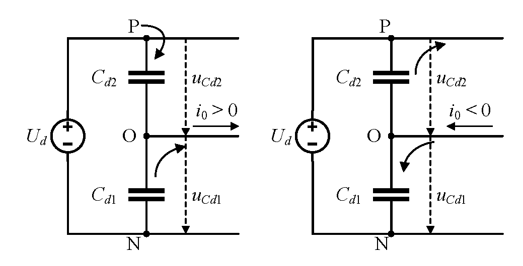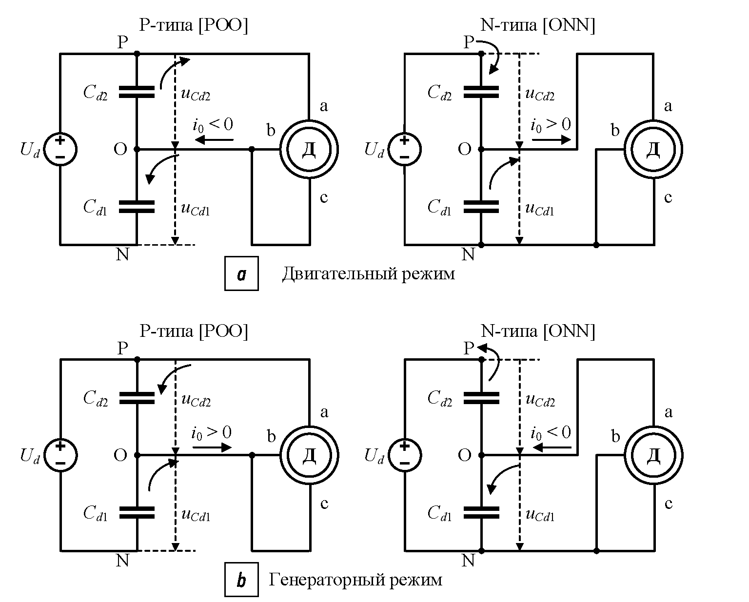 Напротив, для комбинаций состояния N-типа один или два вывода нагрузки подключаются к клемме N источника питания, а остальные выводы — к клемме О. В результате ток НТ i0 вытекает из клеммы O (i0 ˃ 0), вызывая снижение напряжения uCd1 и повышение напряжения uCd2. На примере комбинации [ONN] получено значение тока i0=ia=2Ud13Z>0. По аналогии, в генераторном режиме влияние комбинаций состояний P-типа и N-типа противоположно тому, что в двигательном режиме.