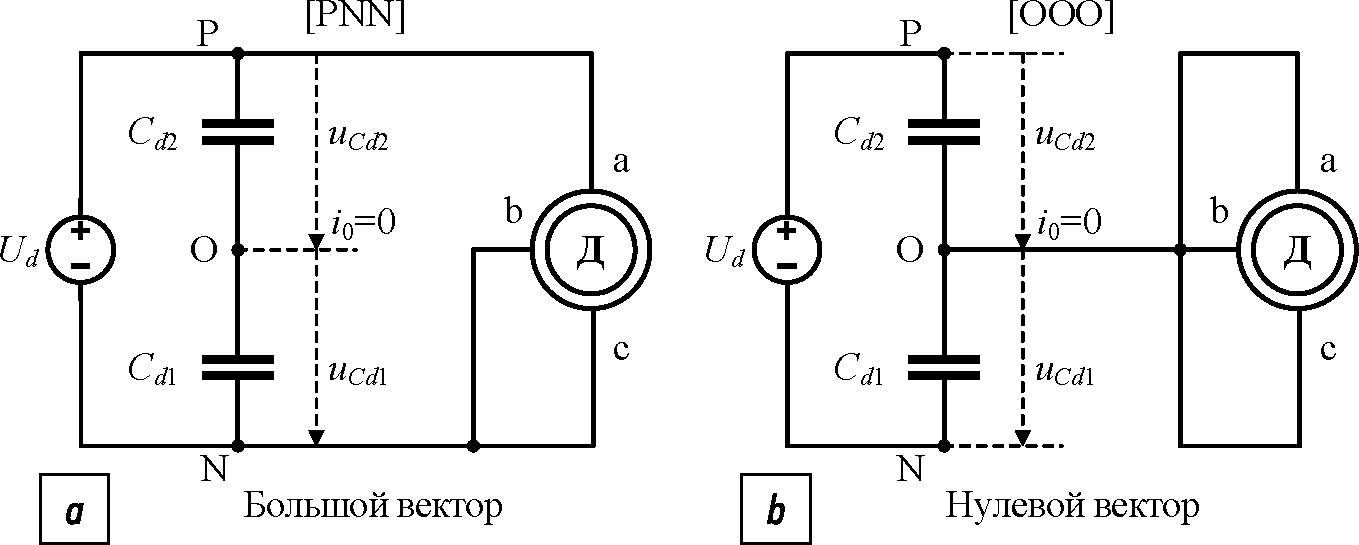 Упрощённые схемы подключения различных базовых векторов напряжений для описания работы обмена электроэнергией в 3У АИН с ФНТ приведены на рис. 3–5. В случае больших базовых векторов (например, комбинация [PNN]) выводы нагрузки подключаются только к положительным и отрицательным клеммам (P и N) источника питания, а нейтральная точка О не имеет соединения с нагрузкой (рис. 3 а). Следовательно, ток i0 не возникает, а значения напряжений uCd1, uCd2 стабилизируются. Это означает, что на напряжение НТ не влияют коммутации состояний больших базовых векторов.