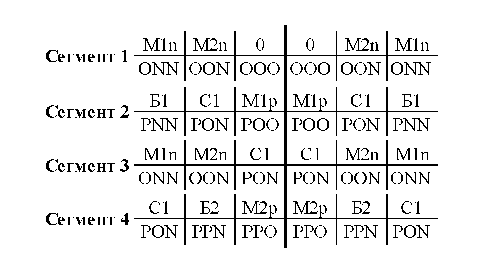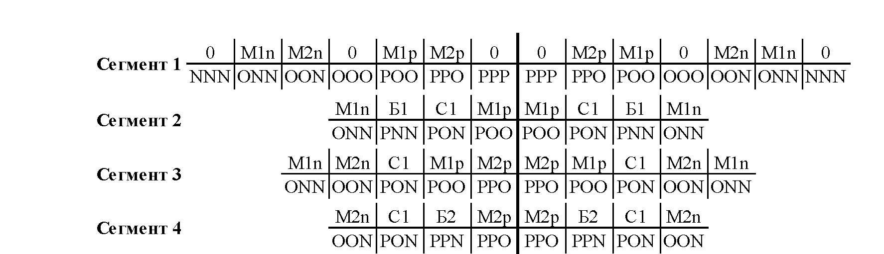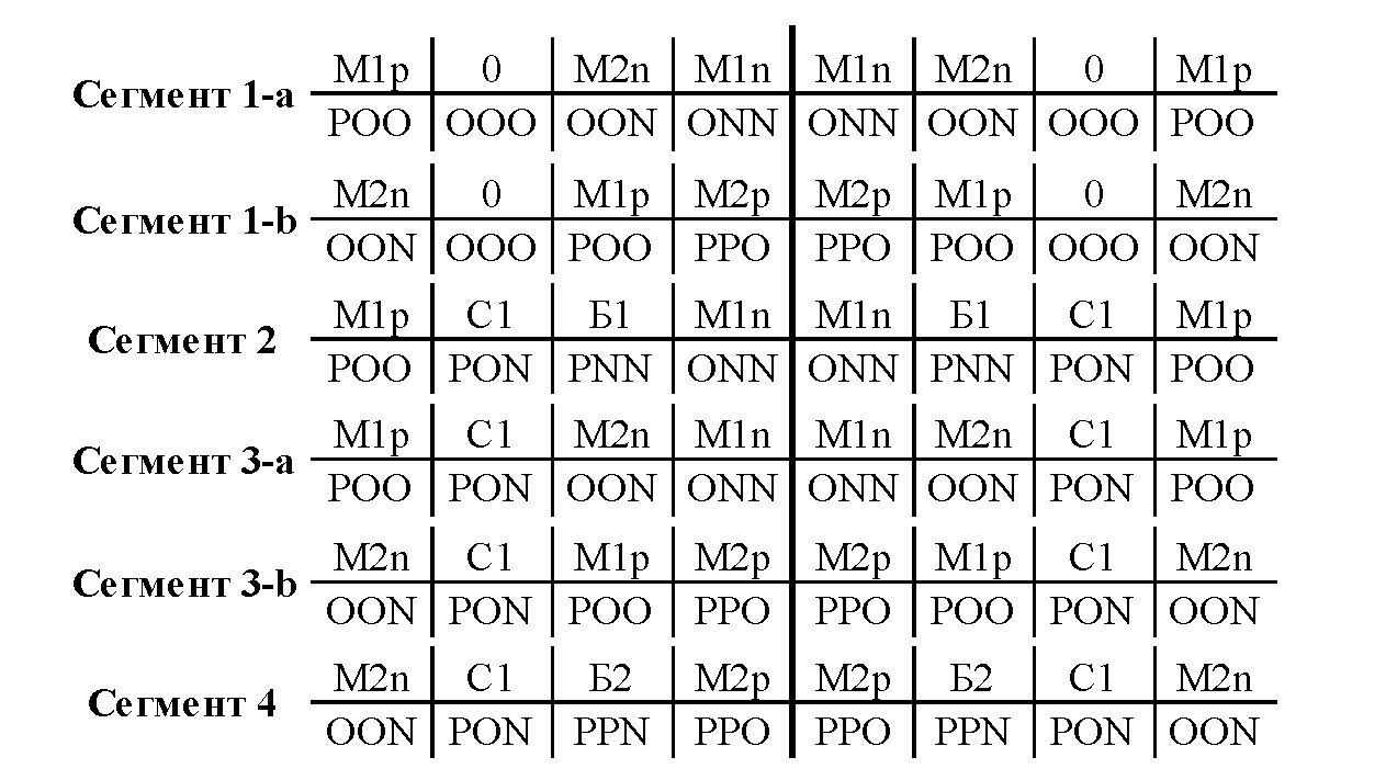 В [12] предложена пятиступенчатая последовательность переключения (рис. 7), в которой только один из двух типов (P или N) комбинаций состояний малых базовых векторов используется в периоде квантования. Например, для данной последовательности в секторе 1 (рис. 6) и сегментах 1, 3 используется только комбинация состояний N-типа малых базовых векторов; а в сегментах 2 и 4 – только P-типа (рис. 7). Следовательно, в пятиступенчатой последовательности дисбаланс напряжения НТ будет проявляться наиболее явно, а количество переключений базовых векторов за один период квантования будет наименьшим и равным 4.