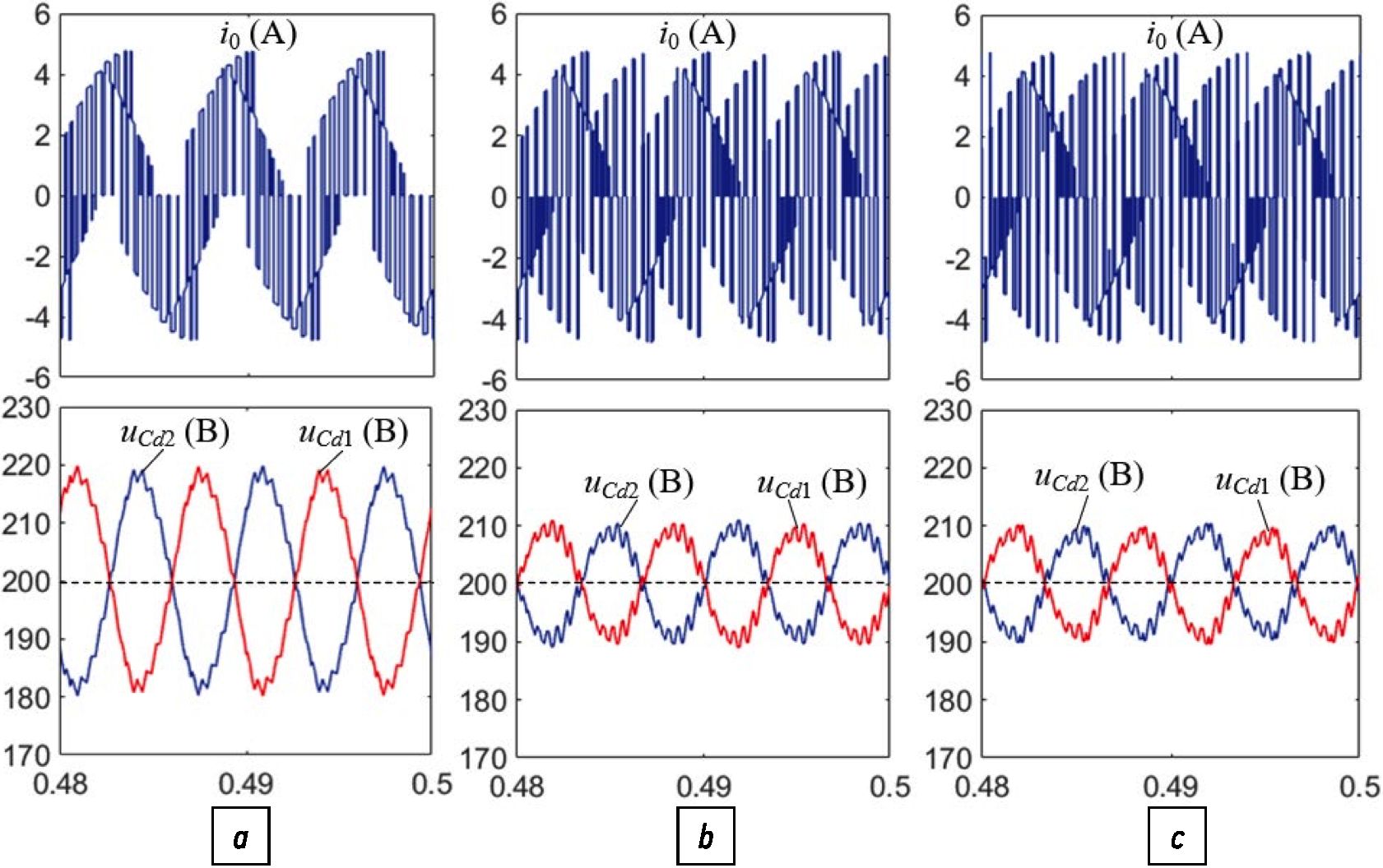 Fig. 10. Time-domain diagrams of current i0 and voltages uCd1, uCd2 at the modulation coefficient μ = 0.8; f(1) = 50 Hz; cos φ = 0.8 for the five-segment (a), the seven-segment (b) and the standard (c) switching sequences.