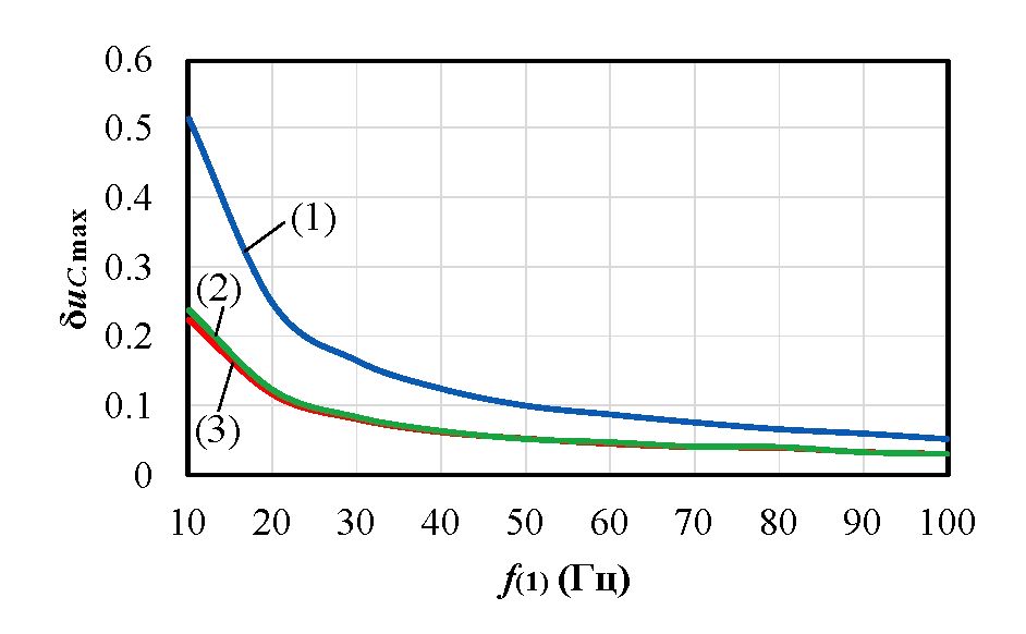 Fig. 12. Dependence of δuC.max on the frequency f(1) at μ = 0.8, cos φ = 0.8 for the five-segment (1), the seven-segment (2) and the standard (3) switching sequences.