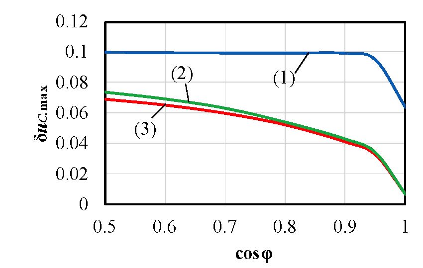 Рис. 13. Зависимость δuC.max от cosφ при μ=0,8, f(1)=50 Гц для пятиступенчатой (1), семиступенчатой (2) и стандартной (3) последовательностей переключений.