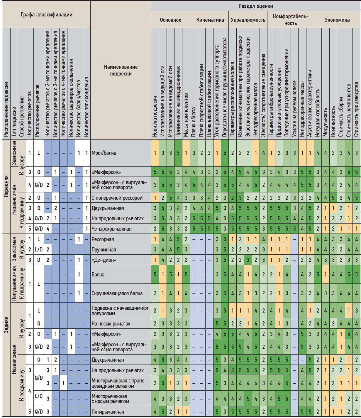 В табл. 2 приводится обобщающая матрица оценок различных типов кинематических схем подвесок по основным критериям и показателям, характеризующим эффективность схемы. Подобного рода обобщённые таблицы представляют особую ценность для автопроизводителей, позволяя более эффективно подходить к вопросу выбора кинематических схем подвесок.