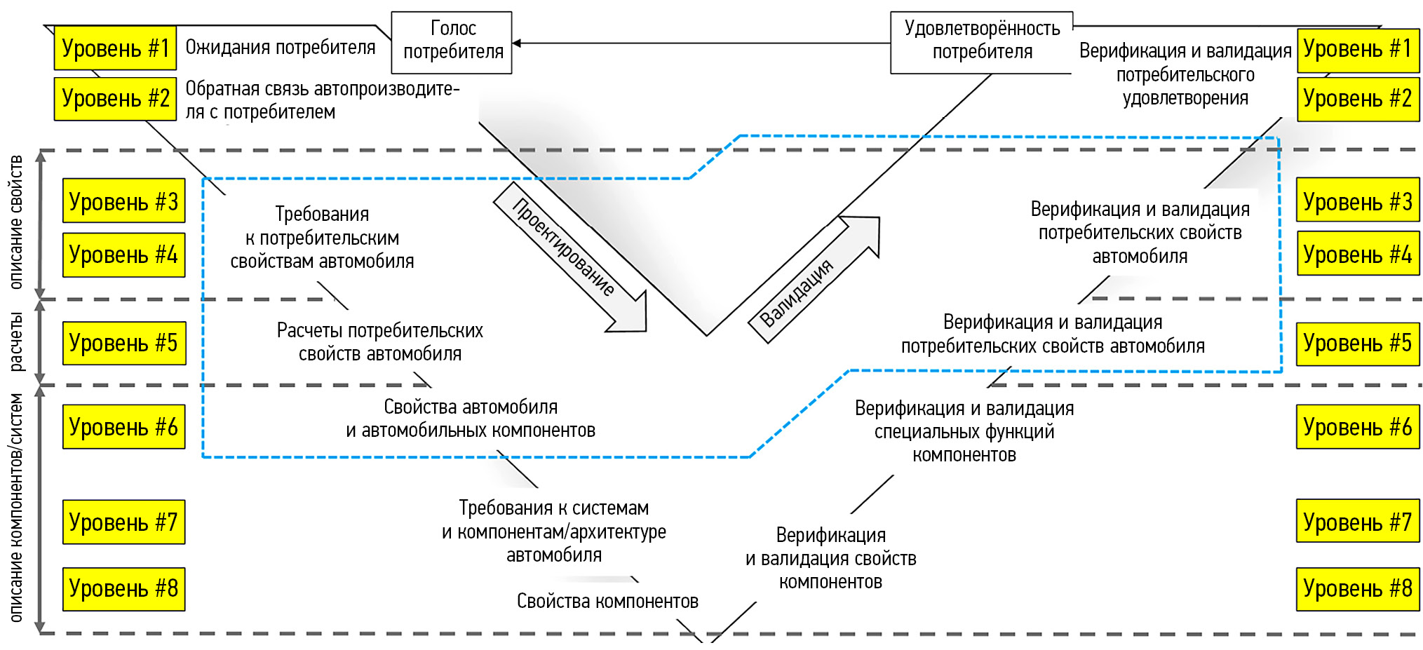 Из анализа списка требований, становится ясно, что градация требований является неочевидной, что вносит неясность в вопросе их эффективного учёта и соблюдения. В данном разделе статьи авторы не предлагают рекомендации по градации требований, а поясняют особенности их учёта при проектировании шасси автотранспортного средства автопроизводителями, поскольку в литературе данный вопрос освящён неочевидно. В настоящее время, при проектировании автомобиля, а в частности шасси автомобиля, автопроизводители пользуются внутренними нормативными документами и стандартами, определяющими процесс проектирования, где данные требования группируются и нормируются. На базе литературного источника [9] классический процесс проектирования шасси автомобиля можно представить в виде V-образной диаграммы (см. рис. 1). На рис. 1 отражены две основные ветви: ветвь проектирования, которая «развёртывает» требования верхнего уровня (голос потребителя) до требований нижнего уровня (свойства компонентов), и ветвь валидации, которая характеризует процесс удовлетворённости поставленных требований от нижнего уровня (подтверждение свойств компонентов) до верхнего уровня (удовлетворённость потребителя).