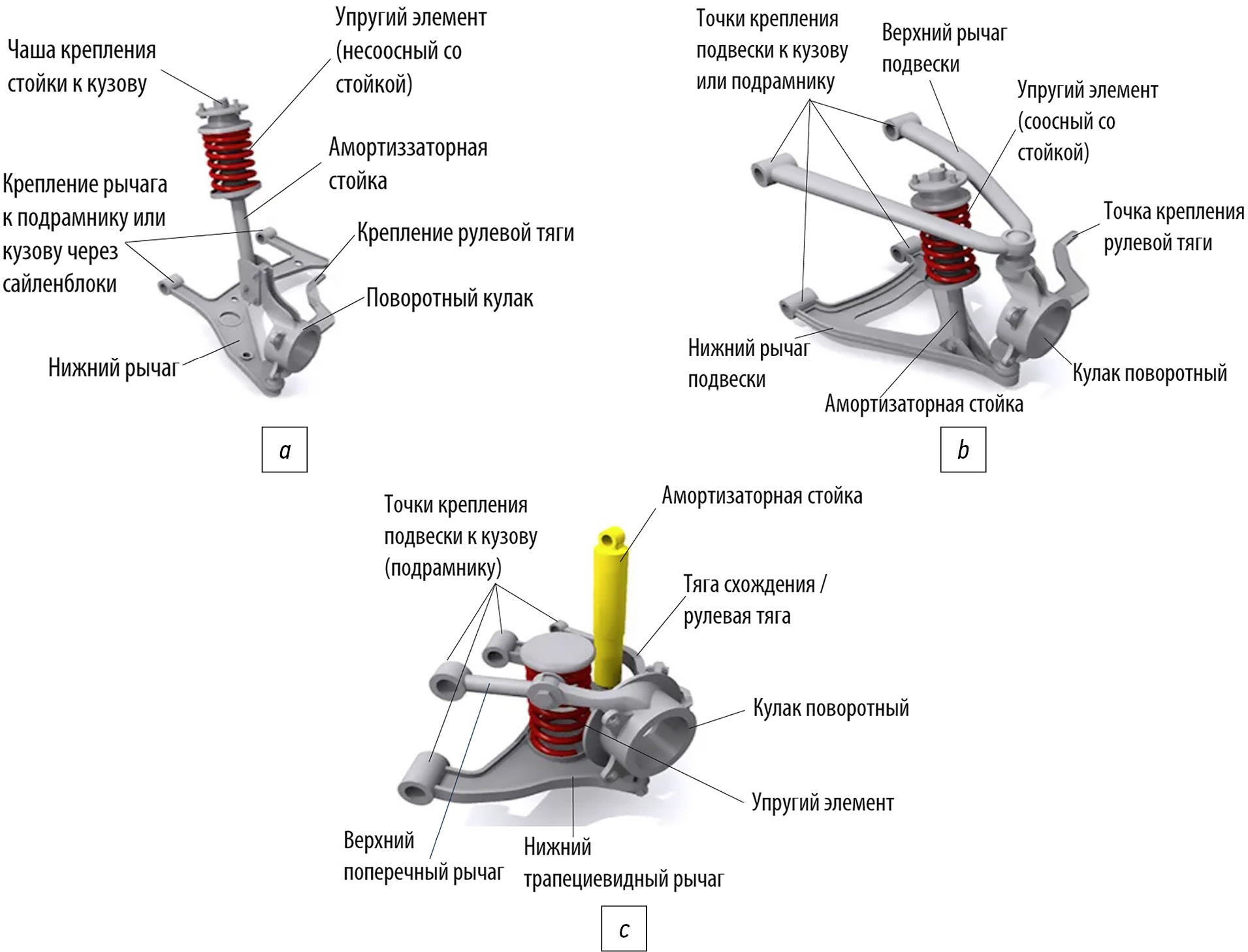 Рис. 2. Перспективные схемы подвесок: a — подвеска типа «Макферсон»; b — двухрычажная подвеска; c — многорычажная подвеска.