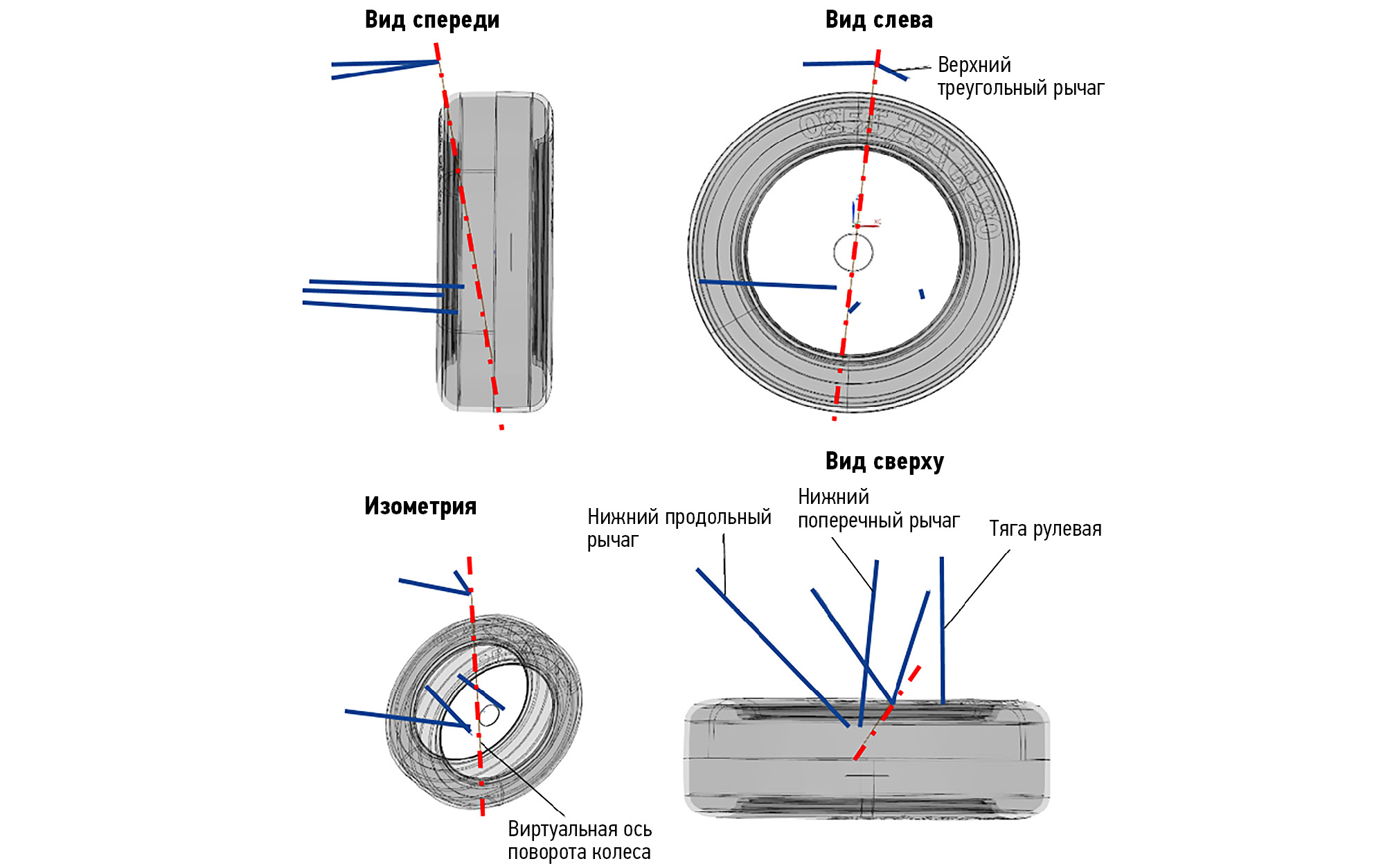 Многорычажная подвеска (см. рис. 2, c). Это значительно усовершенствованная подвеска на двойных рычагах путём разбиения каждого рычага на два отдельных элемента для оптимизации кинематических параметров и расположения их таким образом, чтобы силы, приходящие от поворотного кулака, были направлены вдоль оси элемента, что позволяет значительно уменьшить размеры и массу этого элемента. «Виртуальная» ось поворота колеса для данного типа подвески определяется графическим способом, существуют различные подходы, в зависимости от разновидности многорычажной подвески. На рис. 3 представлен пример, когда ось поворота колеса проходит через центр сферы шарнира верхнего треугольного рычага, а продолжения осей нижних рычагов (продольный и поперечный рычаги) образуют пересечение с осью поворота колеса.