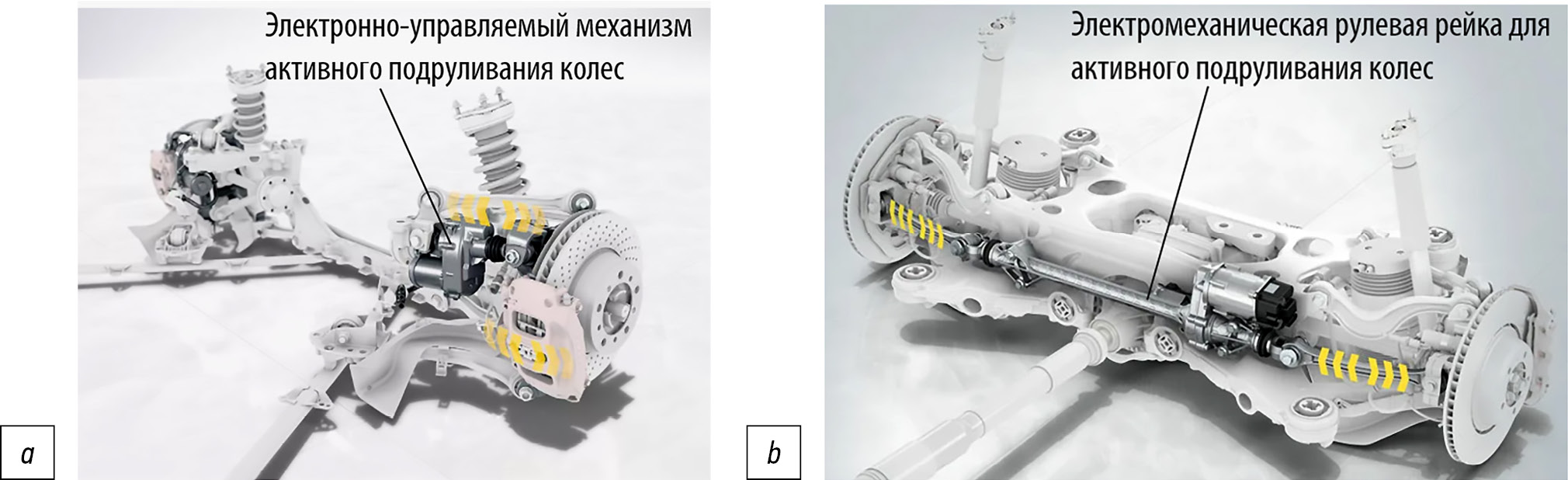 На рис. 4, a отражено техническое решение в виде реализации активного подруливания колёс задней подвески с электронно-управляемыми механизмами подруливания. Электронно-управляемый механизм подруливания каждого из колёс расположен вместо тяги схождения и является частью неподрессоренных масс подвески. На рис. 4, b отражено техническое решение в виде реализации активного подруливания посредством установки единого рулевого механизма с электронным управлением. На понятийном уровне принцип работы активного подруливания колёс задней подвески заключается в том, чтобы при повороте на малых скоростях доворачивать колёса на 1–10 градусов во внешнюю строну поворота автомобиля, что значительно увеличивает манёвренность за счёт смещения полюса поворота ближе к передней оси автомобиля, в то же время при маневрировании на скоростях, как правило, более 40–60 км/ч рулевой механизм поворачивает задние колёса во внутреннюю часть поворота, повышая тем самым управляемость и устойчивость автомобиля за счёт смещения полюса поворота за заднюю ось автомобиля (значительно повышается чувствительность рулевого управления). Существенные недостатки подобного типа подвесок — занимаемое большое компоновочное пространство, сравнительно более трудоёмкий процесс проектирования, необходимость в подрамнике в качестве силовой структуры и значительная стоимость внедрения технических решений. Данные подвески из-за вышеуказанных недостатков практически не применяются на автомобилях класса ниже E, но набирают популярность для применения на автомобилях высшего класса (классы E и F).