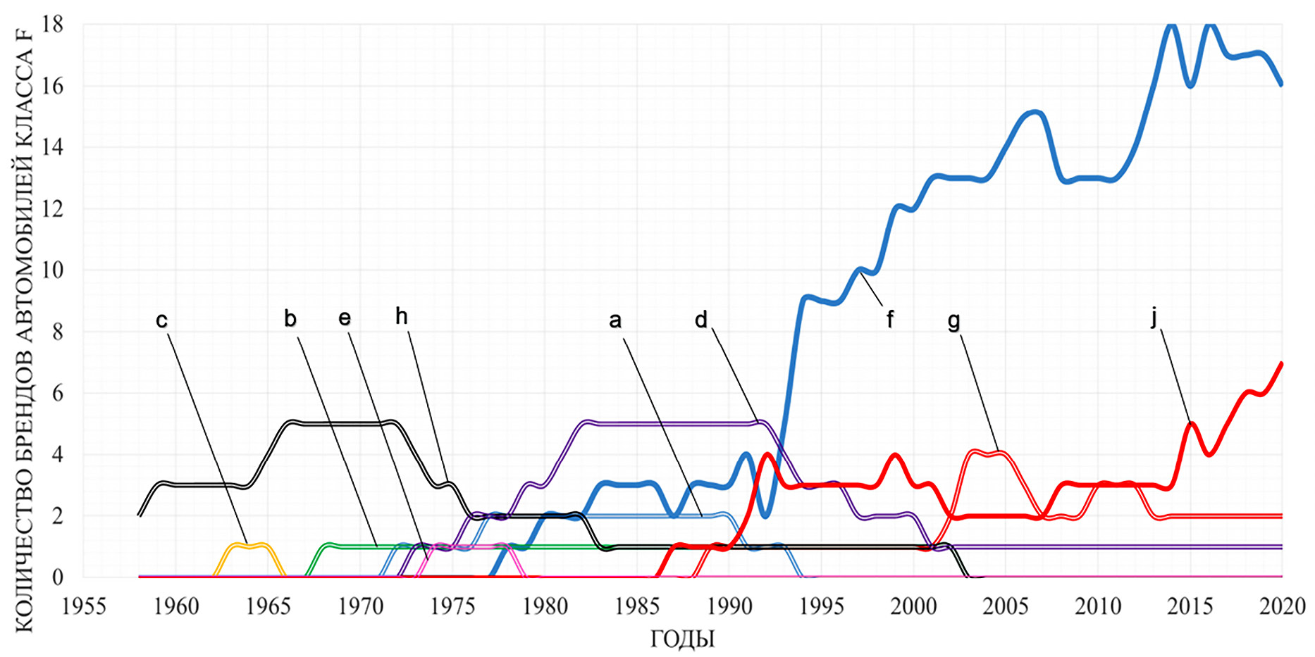 Fig. 5. Trend of using different kinematic schemes of suspension in the F-class vehicles: The trend is to use various kinematic suspension schemes for high-class cars: a — independent suspension on oblique wishbones; b — independent suspension with swing axles; c — De Dion type suspension; d — dependent spring suspension; e — independent hydropneumatic suspension; f — independent multi-link suspension; g — independent suspension on double wishbones; h — dependent spring suspension; j — independent multi-link suspension with active steering.