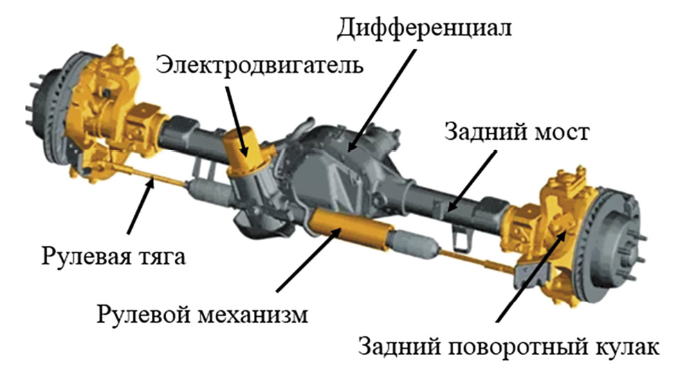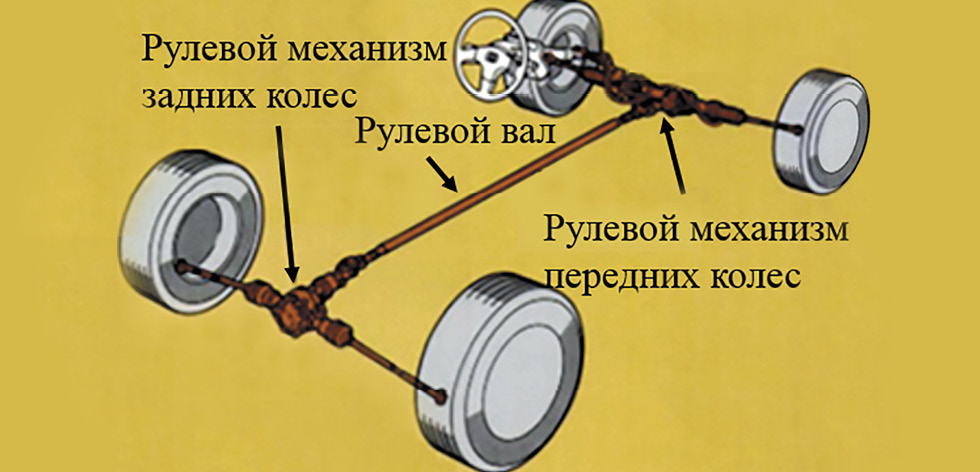 Исключением из общих тенденций является также применение заднего рулевого управления на автомобиле типа пикап, называемое Quadrasteer (рис. 9). В данном случае рулевой механизм подруливания задних колёс сочетается с зависимой подвеской на полуэллиптических рессорах [17].