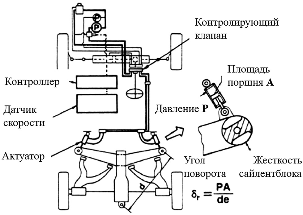 Еще одним примером использования нестандартной конструкции управления поворотом задних колёс является система Nissan HICAS (High Capacity Active Steering), идея которой заключается в повороте всем задним подрамником (рис. 8) [16].