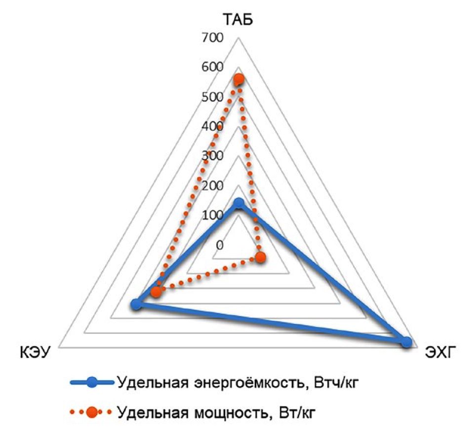Рис. 1. Удельная энергоёмкость и мощность ТАБ и ЭХГ по от дельности и в составе КЭУ.