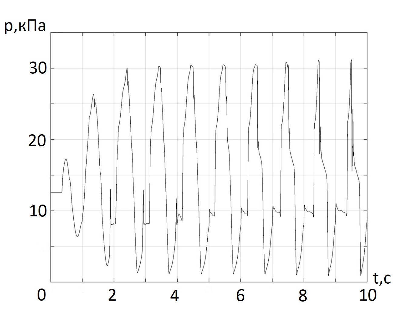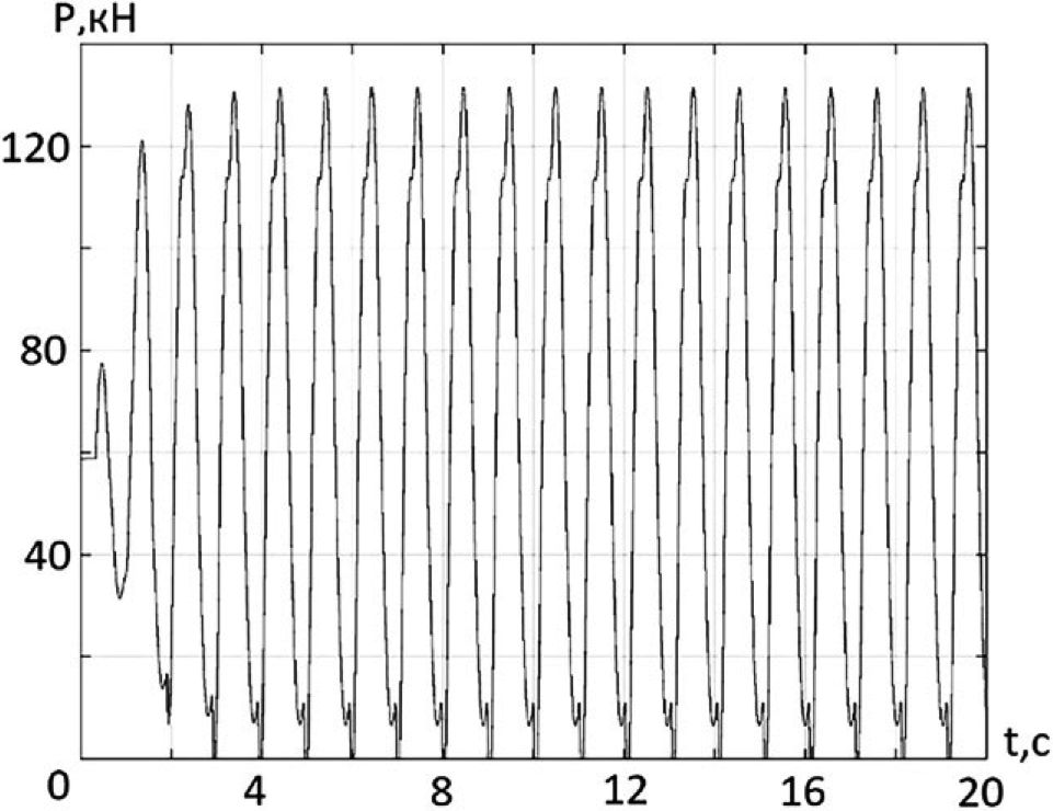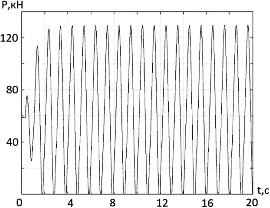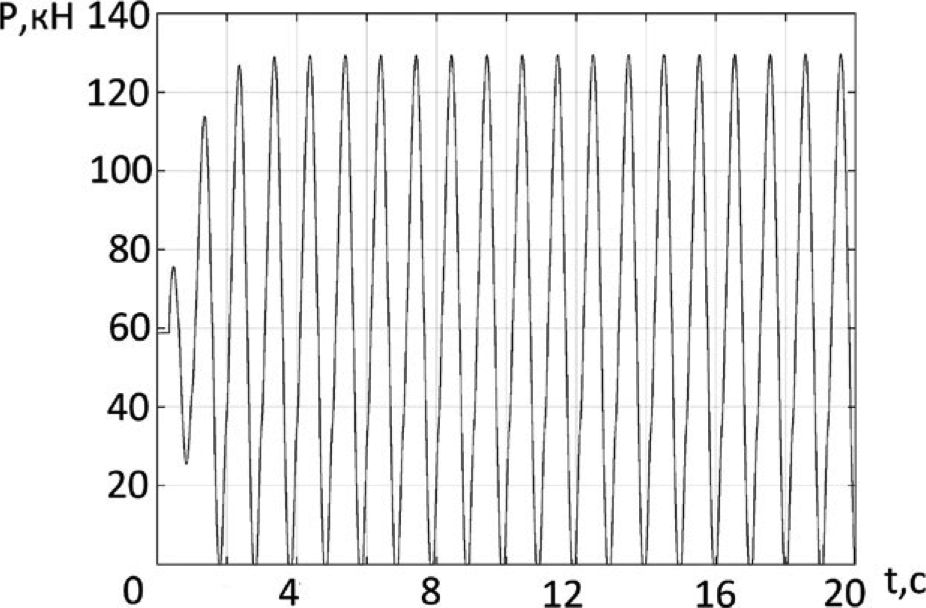 - Выбор клапанной характеристики демпфера (участок 3 рис. 1) проводится при моделировании движения машины, когда передние подвески совершают полный ход. Этого можно добиться в резонансном режиме по продольно-угловым колебаниям. При этом ведётся запись хода передней подвески и давление в ПГР (рис. 6 и 7). Характеристика клапана подбирается так, чтобы давление в ПГР при полном ходе подвески не превышало допустимого с учётом нагрева рессоры.