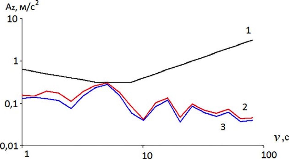 Fig. 13. Results of a ⅓ -octave analysis of vibration accelerations at the driver’s seat: 1 — the standard at 8-hour exposure, 2, 3 — default and new damping characteristic curves.