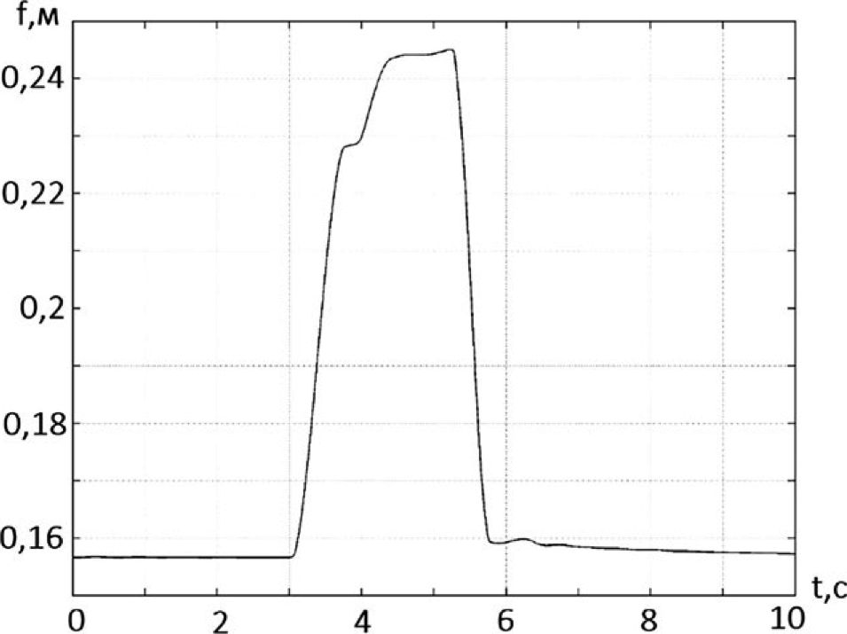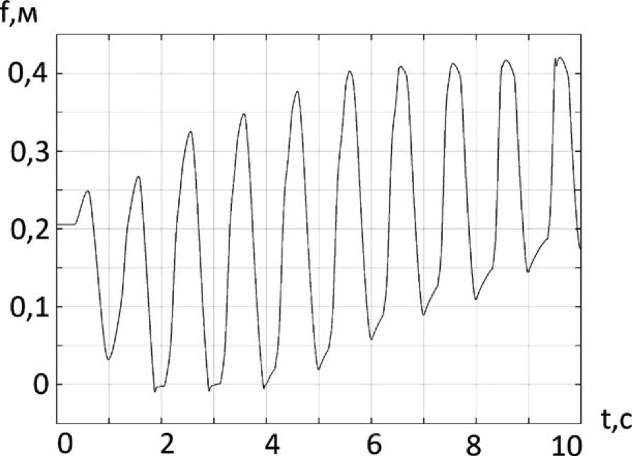 Во время расчётов фиксируются ход первой подвески и сила в шине переднего колеса. Останавливаются на той высоте неровностей, при которой сила в шине передних колёс становится равной нулю (рис. 3).