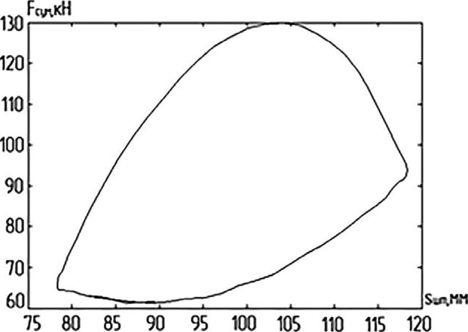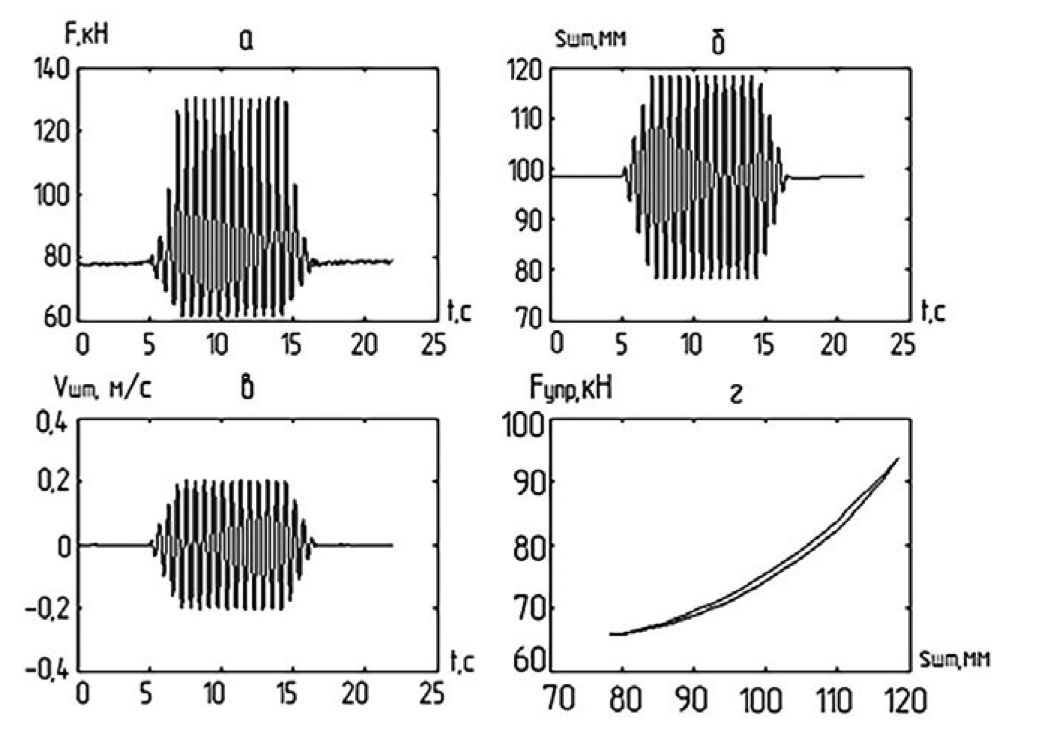 Упругую характеристику берут со статических испытаний ПГР, при которых перемещают шток на полный ход с минимальной скоростью и записывают силу на штоке в зависимости от перемещения штока. Из данной характеристики выделяют фрагмент (рис. 8, d), соответствующий ходу штока при динамических испытаниях (определение демпфирующей характеристики).