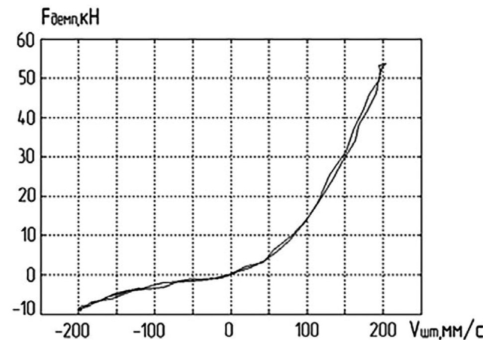 Зависимость суммарной силы демпфирования (суммарное влияние силы механического трения и силы вязкостного трения) от скорости хода штока Fдемп = φ(vшт) получают следующим образом: