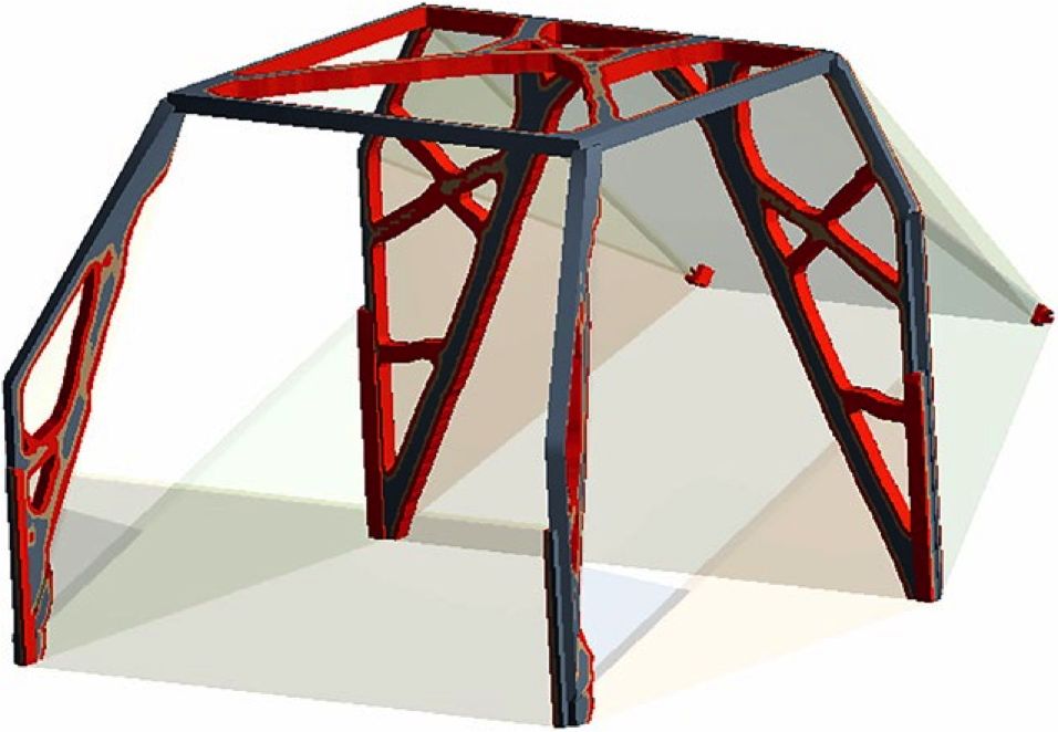 Цель работы заключается в повышении жёсткости конструкции каркаса безопасности за счёт разработки новой схемы расположения усиливающих элементов на базе топологической оптимизации.
