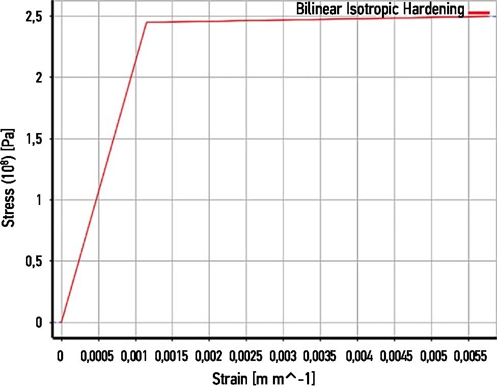 Материал труб — сталь 20. При испытаниях каркаса безопасности данный материал работает в зоне пластических деформаций, в виду этого необходимо учитывать физическую нелинейность свойств. Подробное описание модели материала представлено в предыдущей работе [2].