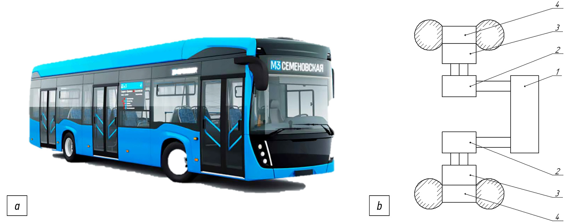 Рис. 1. Общая схема и общий вид электробуса: a) общий вид электробуса, b) общая схема электрооборудования; 1 — тяговая аккумуляторная батарея, 2 — инвертор, 3 — тяговый электродвигатель, 4 — трансмиссия.