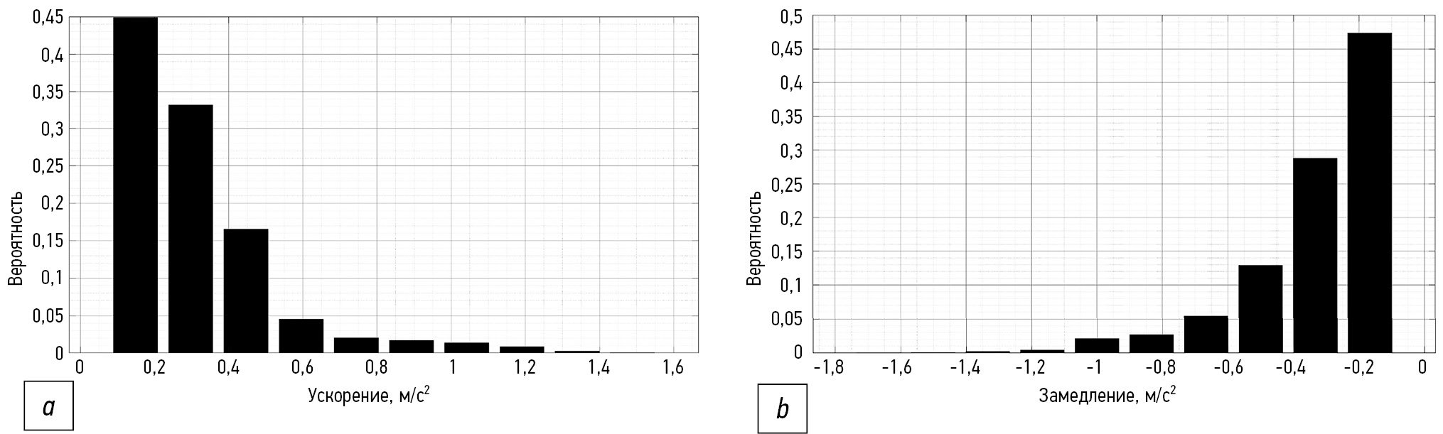 Fig. 2. Probability of distribution of accelerations (a) and decelerations (b) of an electric bus during its service.
