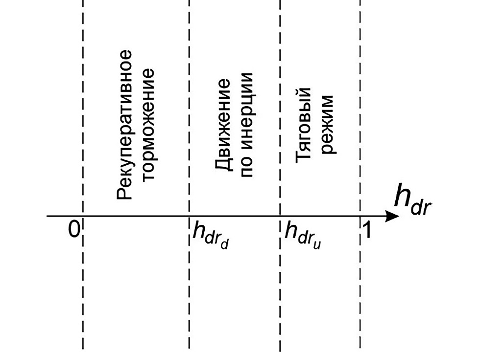 Для обеспечения плавного (без рывков) перехода из зоны тягового режима в зону движения по инерции необходимо границу hdru между этими режимами располагать в окрестности нулевого продольного ускорения электробуса ax0. Условием равномерного (без ускорения) движения будет равенство нулю углового ускорения ω˙ вала тягового электродвигателя: