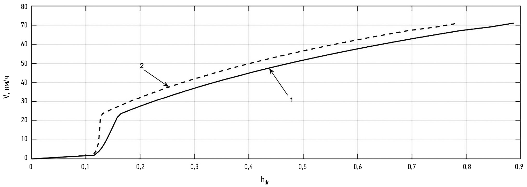 На рис. 4 показаны зависимости hdru и hdrd mот скорости движения V для электробуса КАМАЗ-6282 [1].