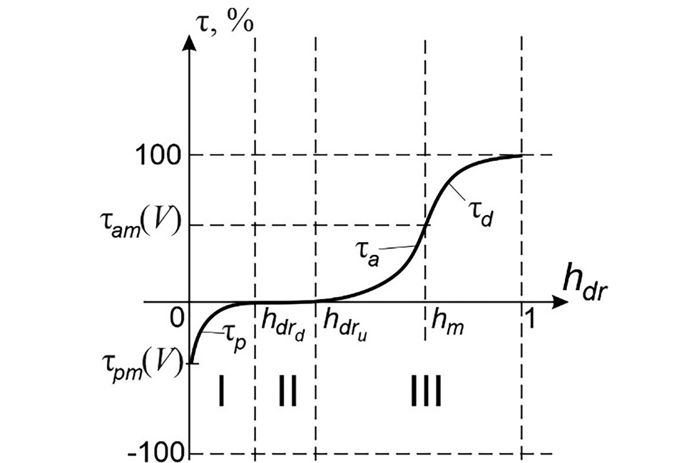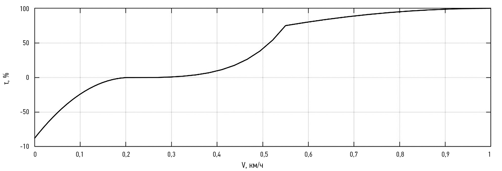 2. График задания момента при приближении к границам зоны движения по инерции должен иметь асимптоту τ = 0, где τ — уставка крутящего момента в процентах от максимально доступного. (рис. 5), чтобы избежать повышенных динамических ударных нагрузок в зубчатых зацеплениях, из-за возникновения автоколебательных процессов в контуре векторного управления моментом двигателя вследствие изменения положения границ зон hdru и hdrd при изменении скорости движения.