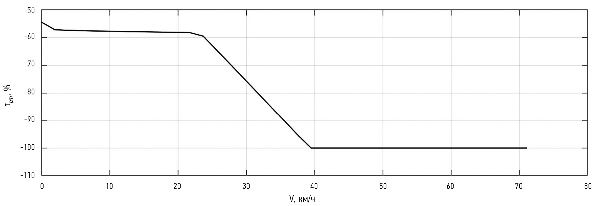 Для определения зависимости уставки τpm от скорости движения определимся, что при рекуперативном торможении максимальное значение замедления не должно превышать ax = -1,4 м/с2 по условиям обеспечения комфорта пассажиров. Исходя из анализа дифференциального уравнения торможения транспортного средства, с учётом в первом приближении равенства рекуперативных моментов на левом и правом электродвигателе
