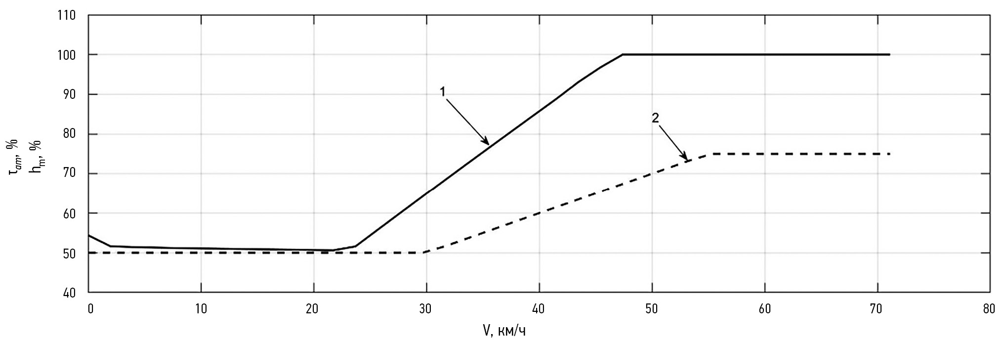 Рис. 8. Зависимости τam (1) и hm (2) от скорости движения для электробуса КАМАЗ-6282.