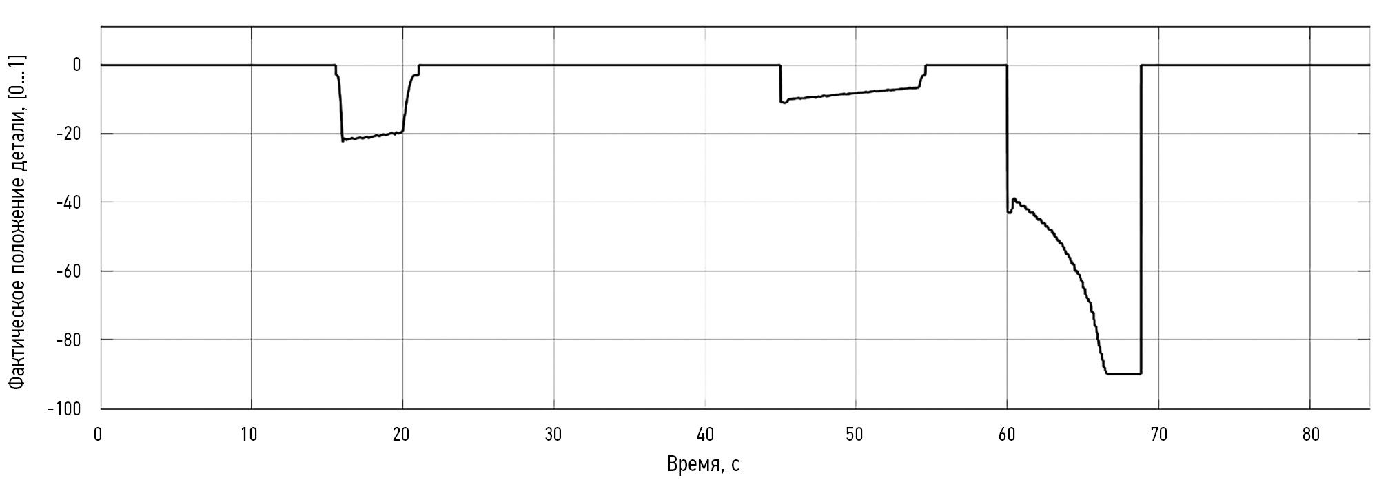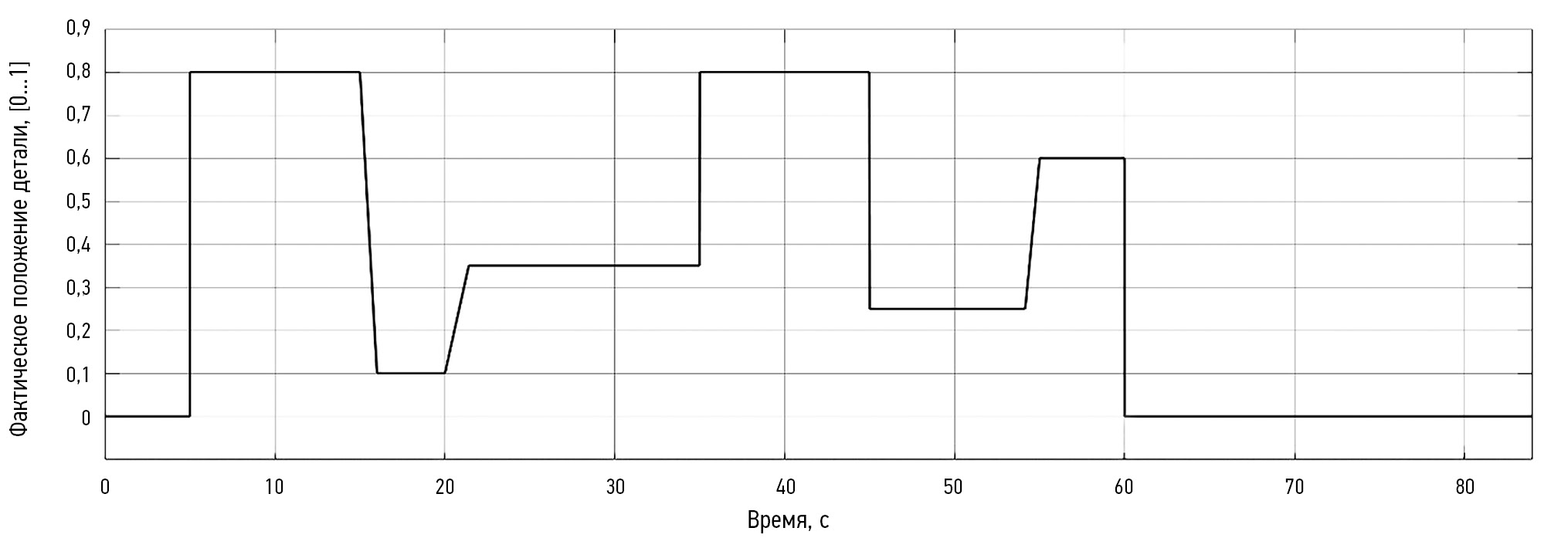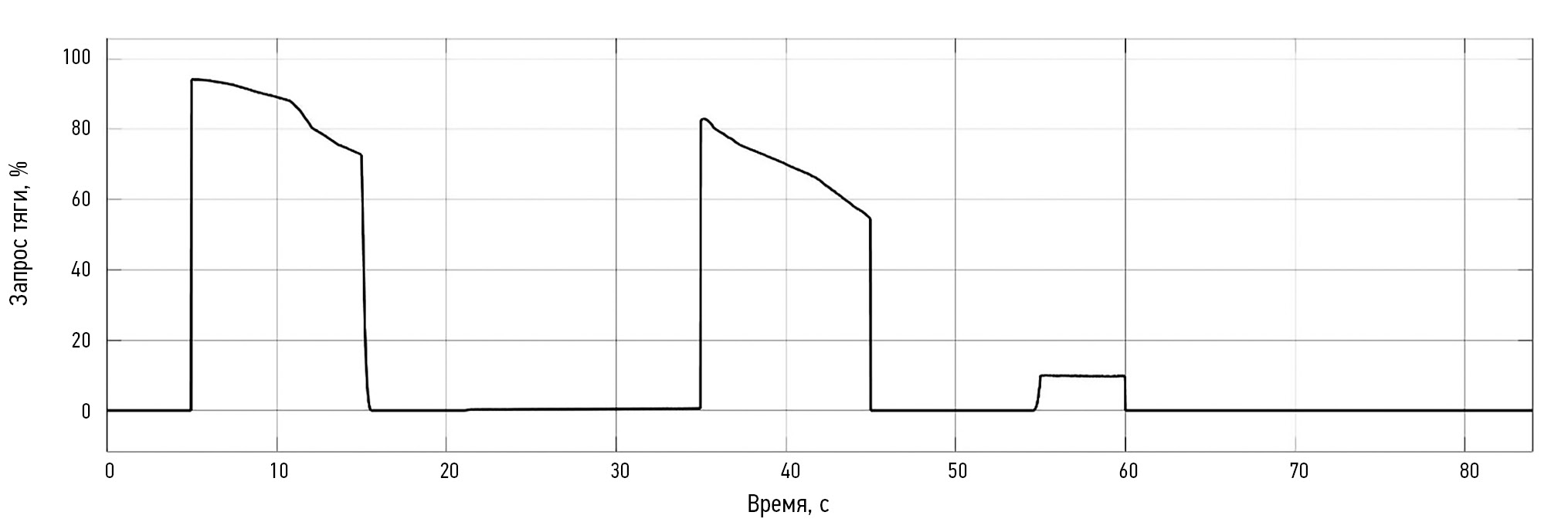 Были проведены виртуальные испытания электробуса с однопедальным управлением. На рис. 12 представлена циклограмма изменения положения педали хода, которая является управляющим воздействием со стороны водителя.