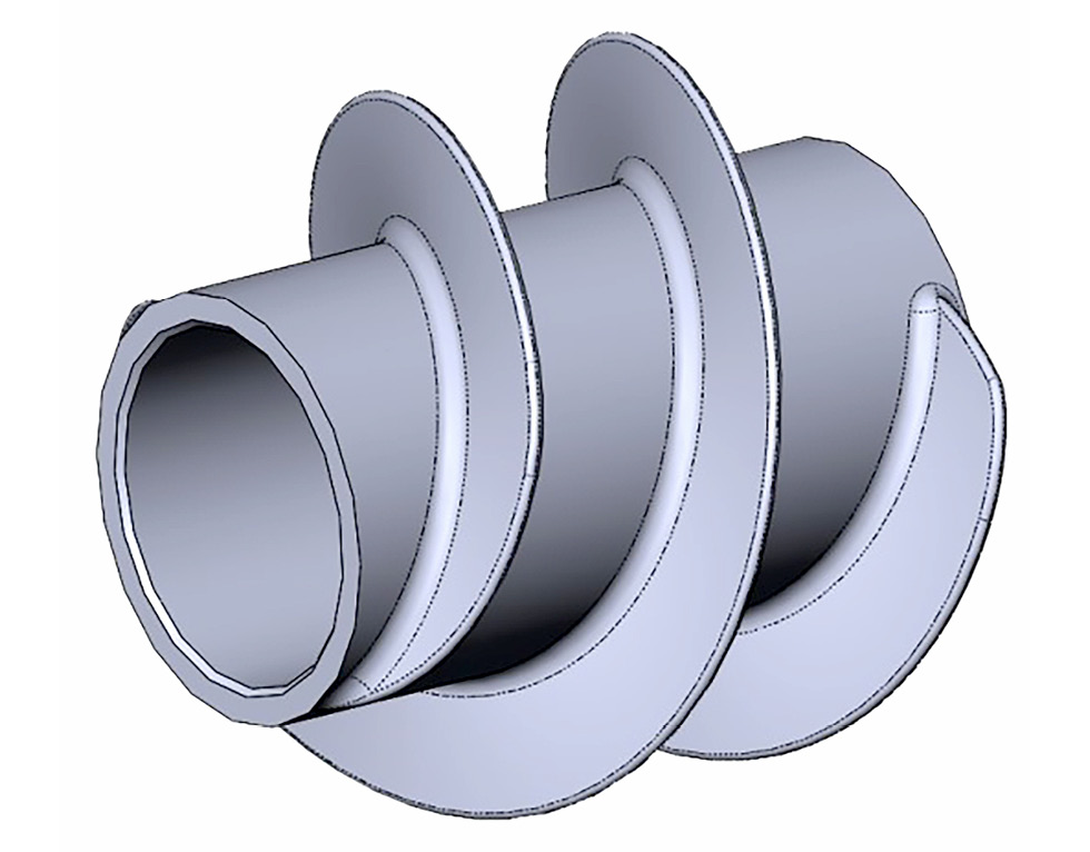 Для проведения сравнения кавитационных свойств передвижной насосной установки с предвключенным шнеком и без него с использованием методов гидродинамического моделирования (CFD) был рассчитан шнек. Шнек — это предвключенная осевая ступень в центробежном насосе, предназначенная для создания подпора на входе в центробежное колесо [15–22]. При проектировании осевой ступени было принято решение о разработке шнека постоянного шага, что упрощает процесс расчета и технологический процесс изготовления, в таком случае угол установки лопастей неизменен по длине шнека: