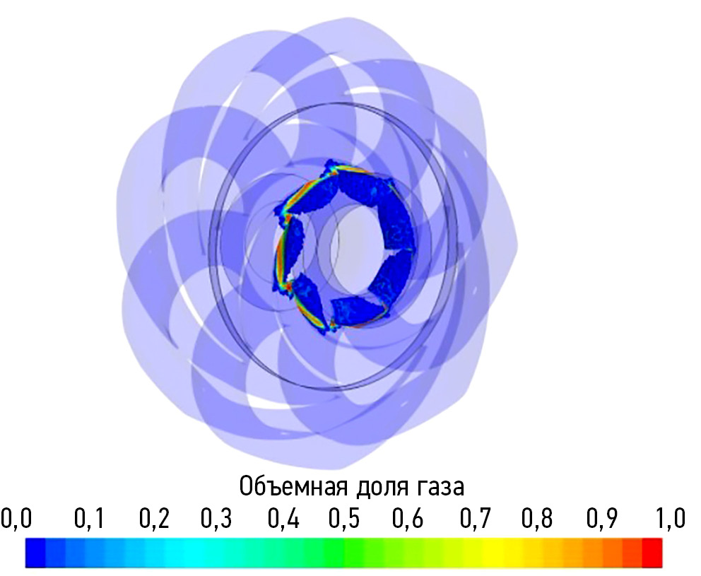 Fig. 6. Gas volume fraction. Distribution of the vapor phase at an inlet pressure of 12 kPa.