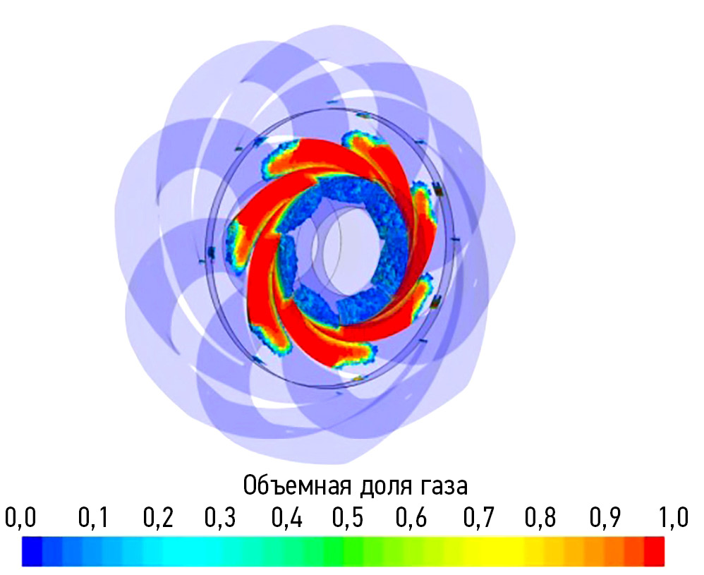 Fig. 3. Gas volume fraction. Distribution of the vapor phase at an inlet pressure of 50 kPa.