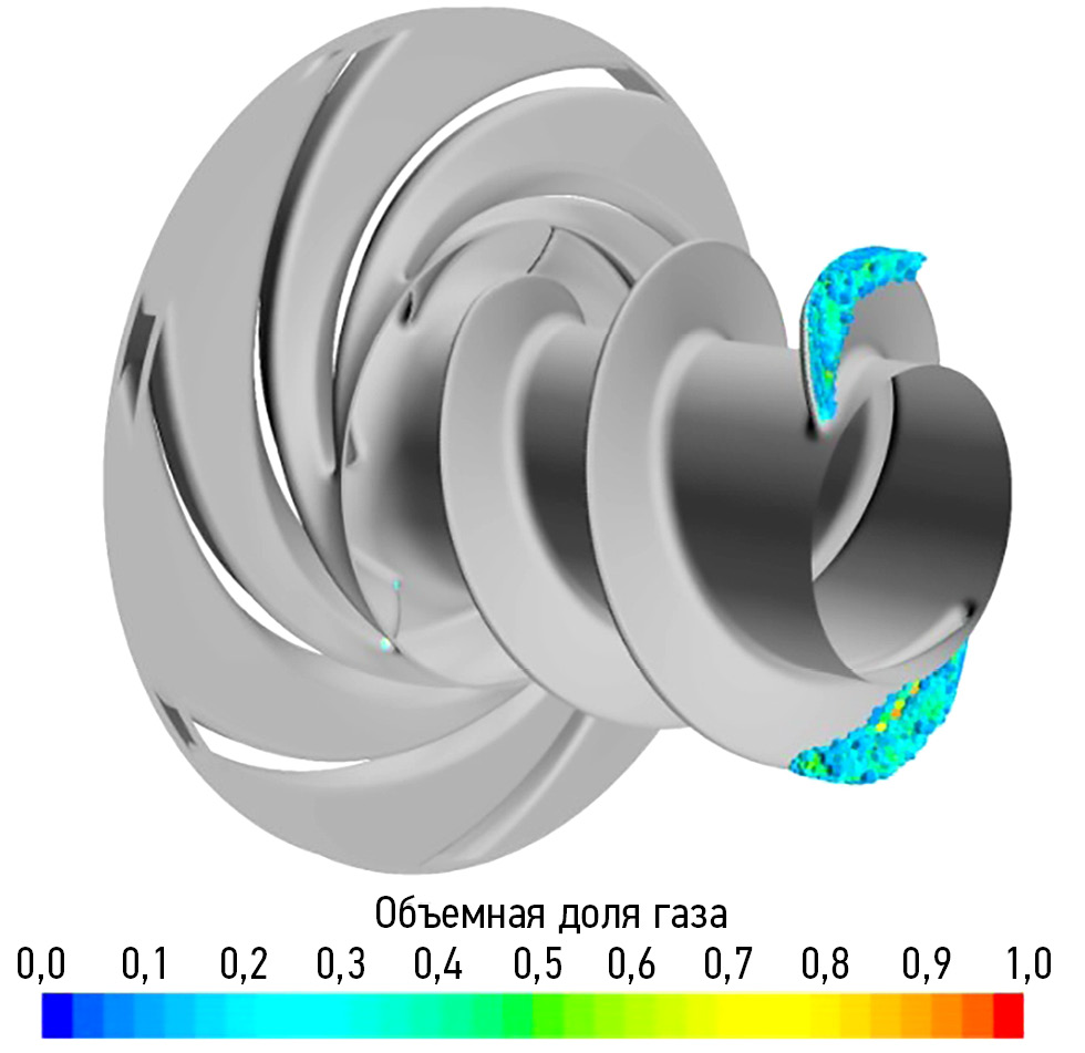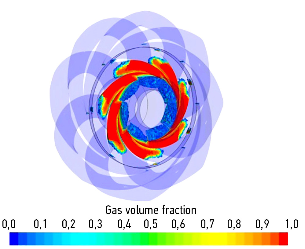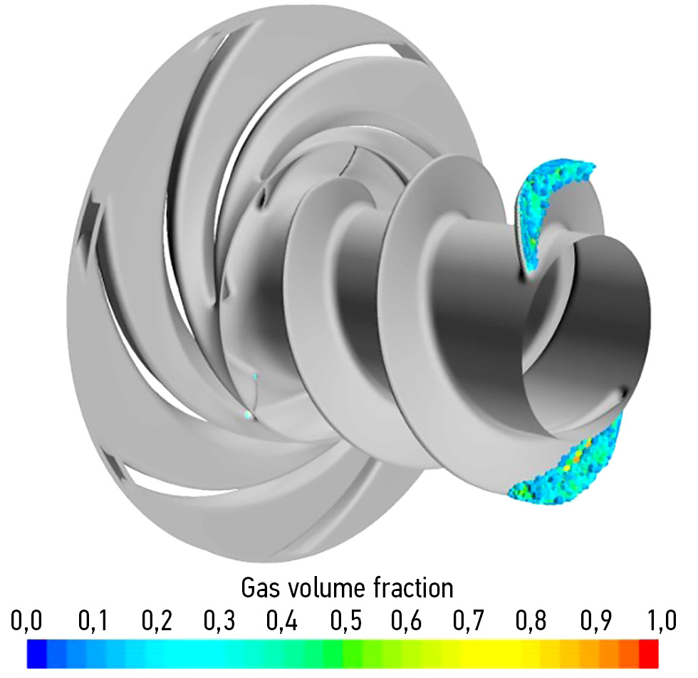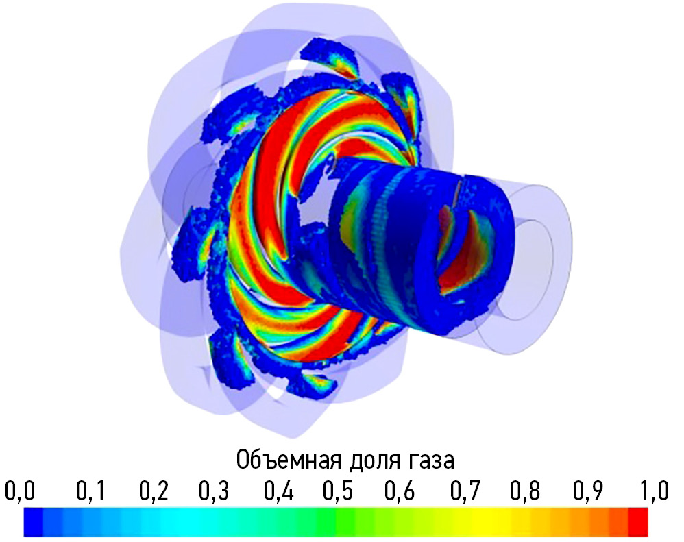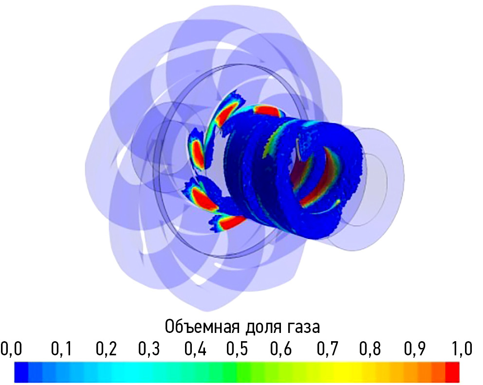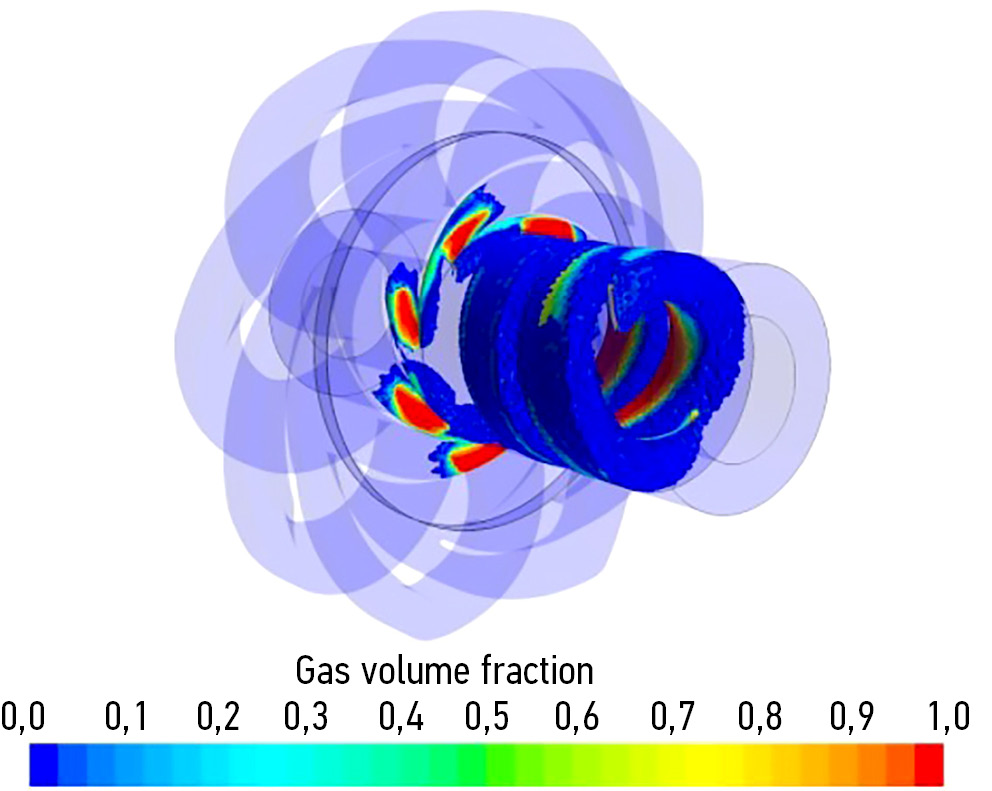 Fig. 4. Gas volume fraction. Distribution of the vapor phase at an inlet pressure of 40 kPa.