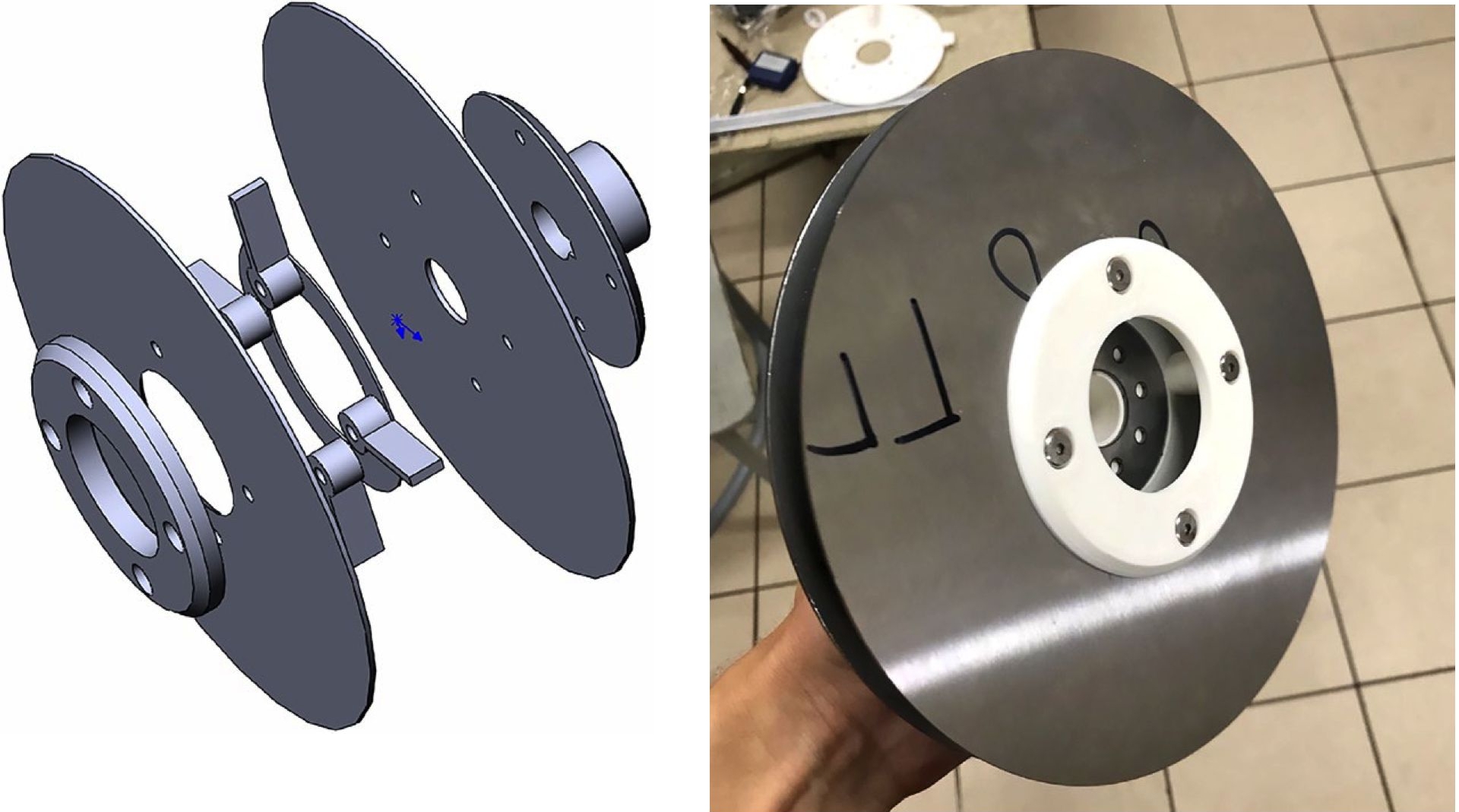 The impeller consists of two metal disks and plastic elements produced using additive manufacturing technologies, namely a shaft bushing, fastening blockings (possibly with blades), and a front (end) groove seal bushing seal. The impeller is shown in Fig. 4.