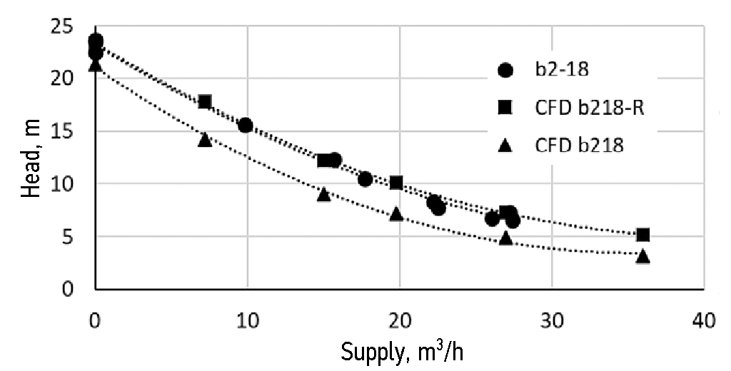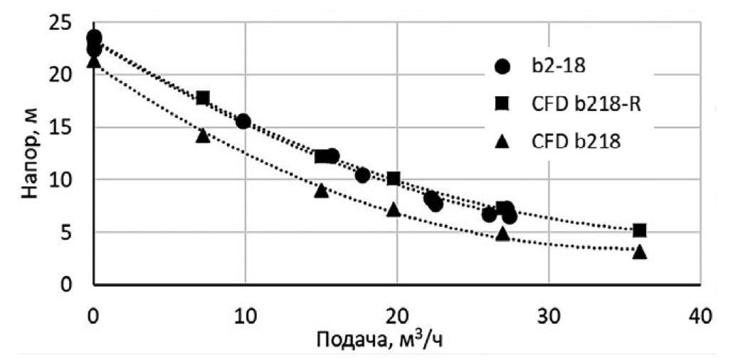 Рис. 6. Характеристики насоса с дисковым рабочим колесом шириной 18 мм: экспериментальная (b2-18), расчётные с учётом шероховатости (CFD b218-R) и без (CFD b218).