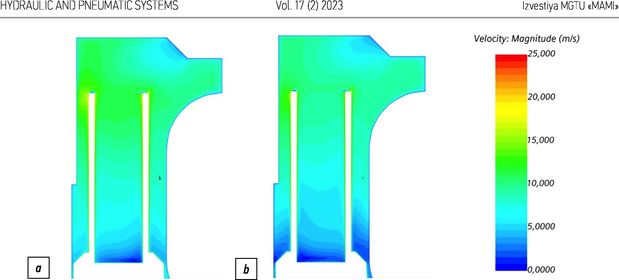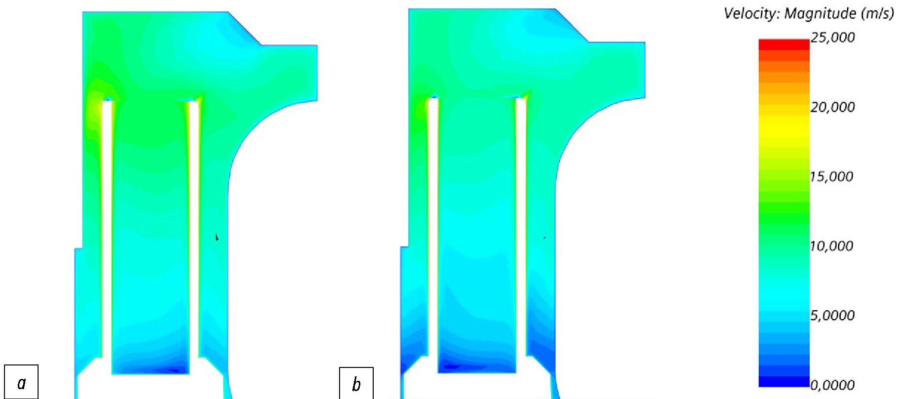 Рис. 7. Поле распределение амплитуды скорости при подаче 15 м3/ч: a) с учётом шероховатости; b) без учёта шероховатости.