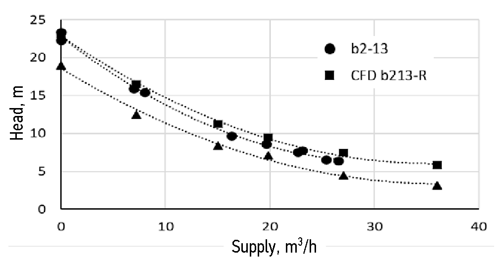 Рис. 5. Характеристики насоса с дисковым рабочим колесом шириной 13 мм: экспериментальная (b2-13), расчётные с учётом шероховатости (CFD b213-R) и без (CFD b213).