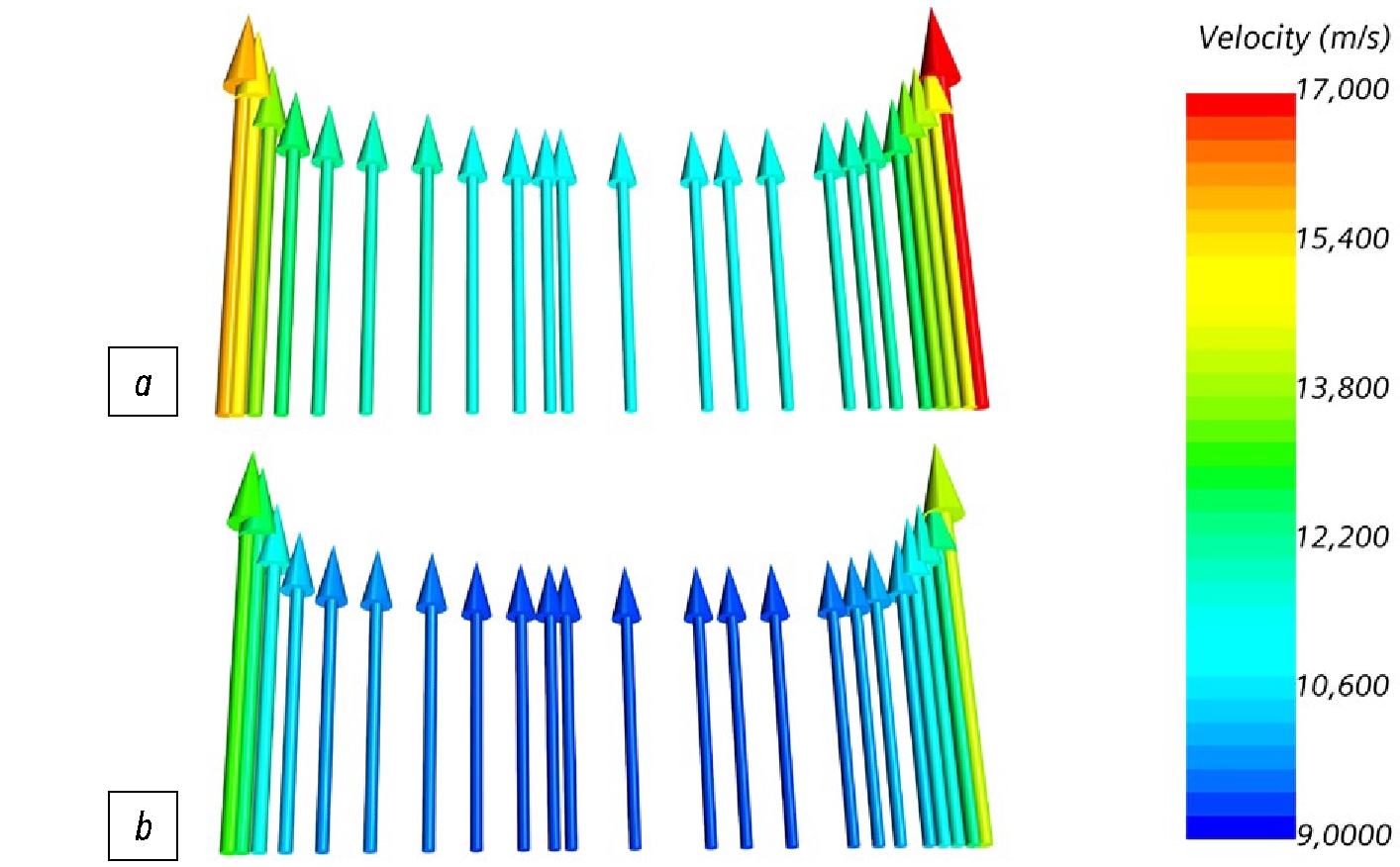 Fig. 8. The circumferential velocity of the fluid at the outlet of the impeller at a supply of 15 m3/h: a) with roughness; b) without roughness.