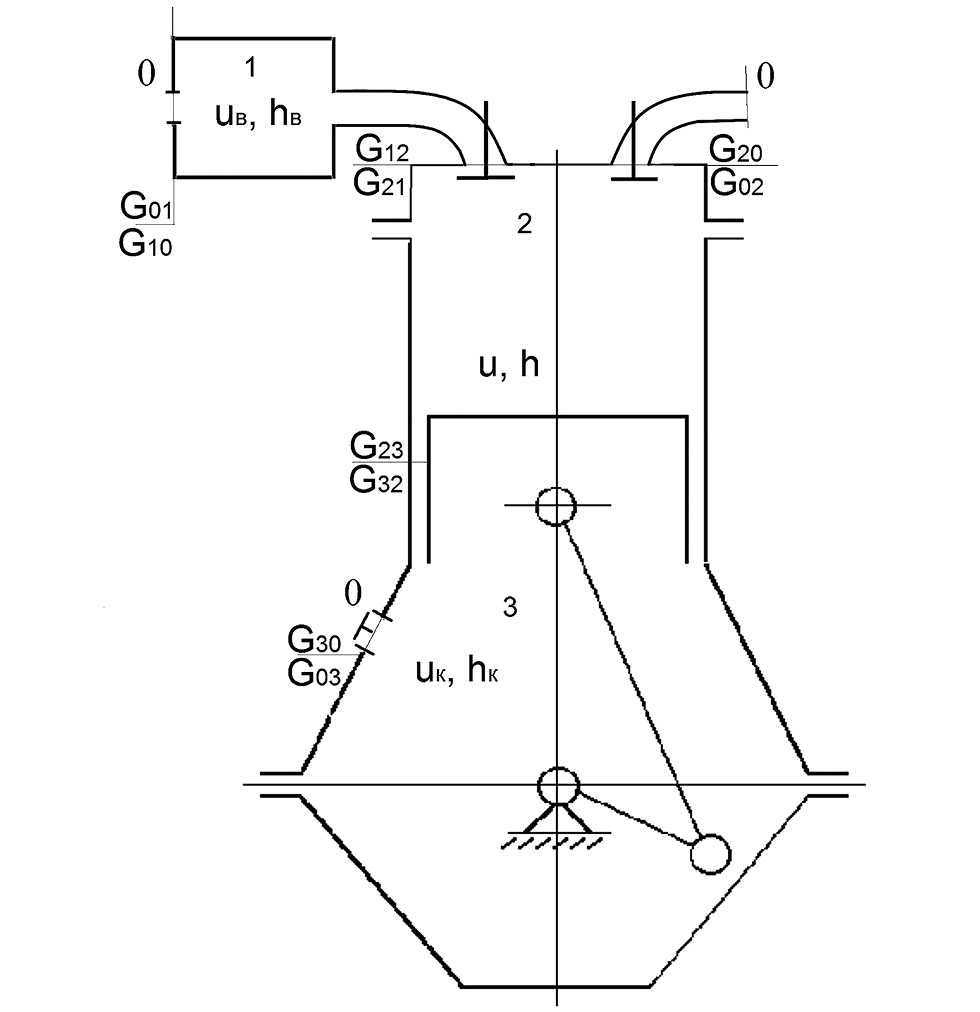 На рис. 1 приведена расчётная схема ДВС, построенная с точки зрения тепломеханики (термодинамики открытых систем).