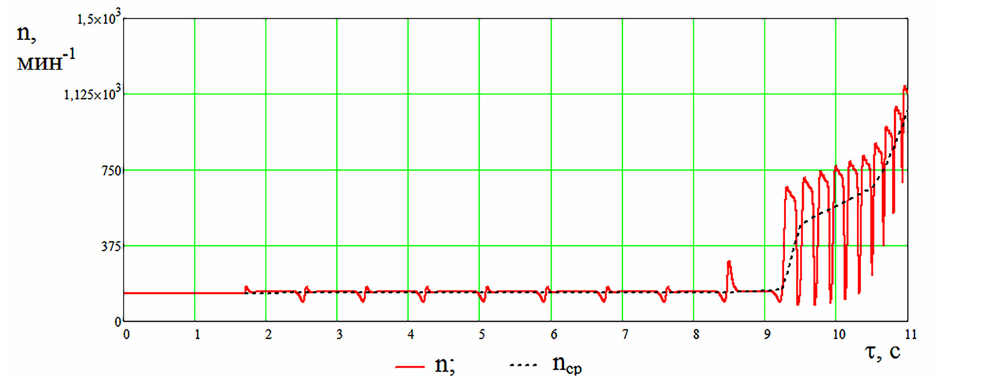 Fig. 2. Changing the instant and average rotation frequencies at the mode of engine rotating with a starter and consequent starting.